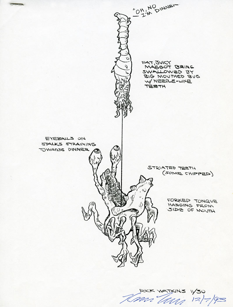 There happened to be one young designer in Kenner’s art department, named, Rick Watkins. Although we never met, my partner Andy, was told that Rick, in particular, found our Creatures inspiring, and was itching to get work on them. Thus, Rick was extremely disappointed that he could not participate. Nonetheless, Kenner allowed him a day or two to make some sketches, elaborating on, and enhancing some of my designs to give them a look that Kenner had in mind. I liked what he did. By the way, I never got to speak to anyone in Kenner’s art department personally. Andy became the go-between, communicating with one of Howard’s art directors, another man I was not destined to meet, named Ken. I can’t make out his second name, from his signature, on some of the communications.