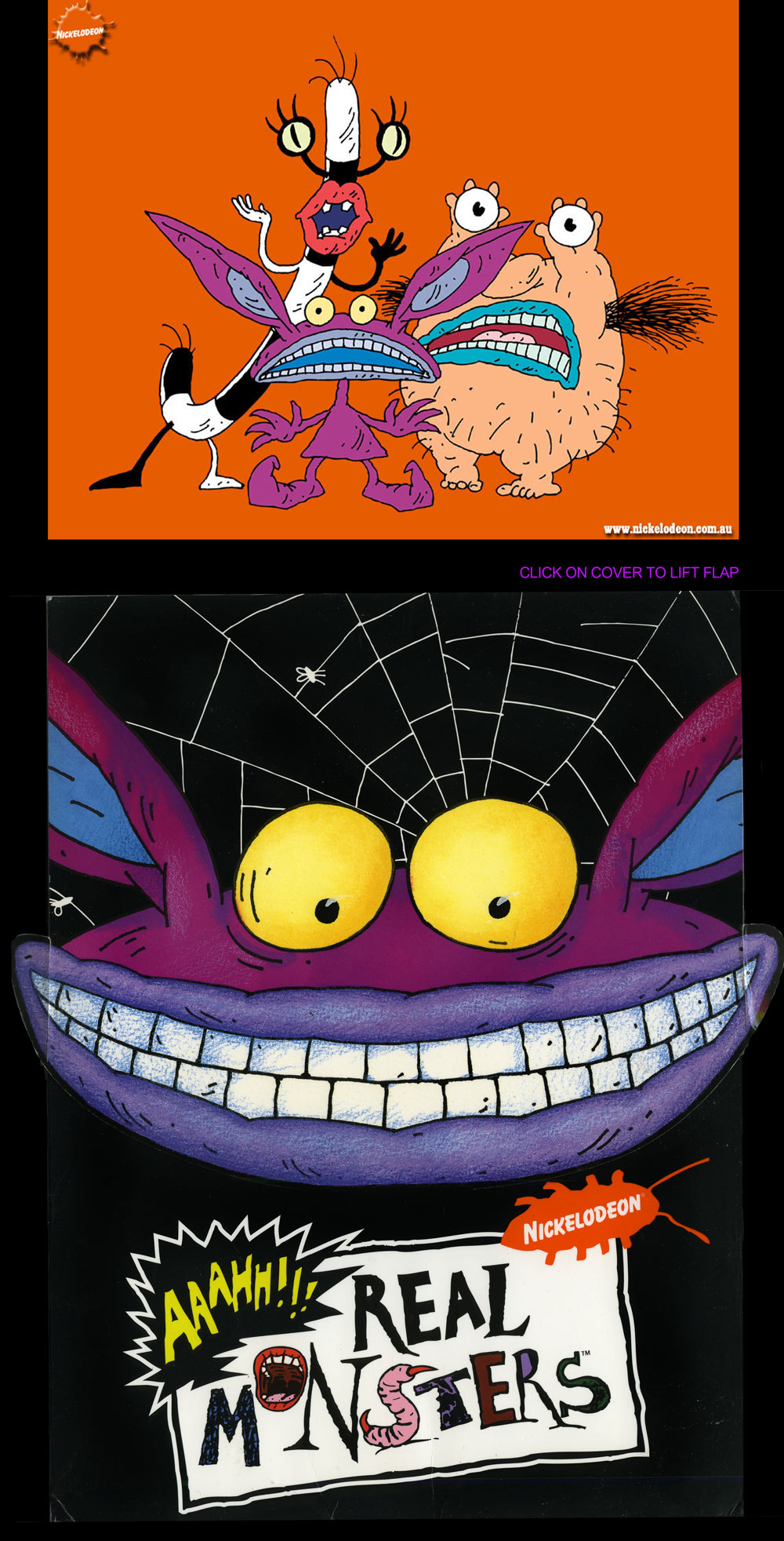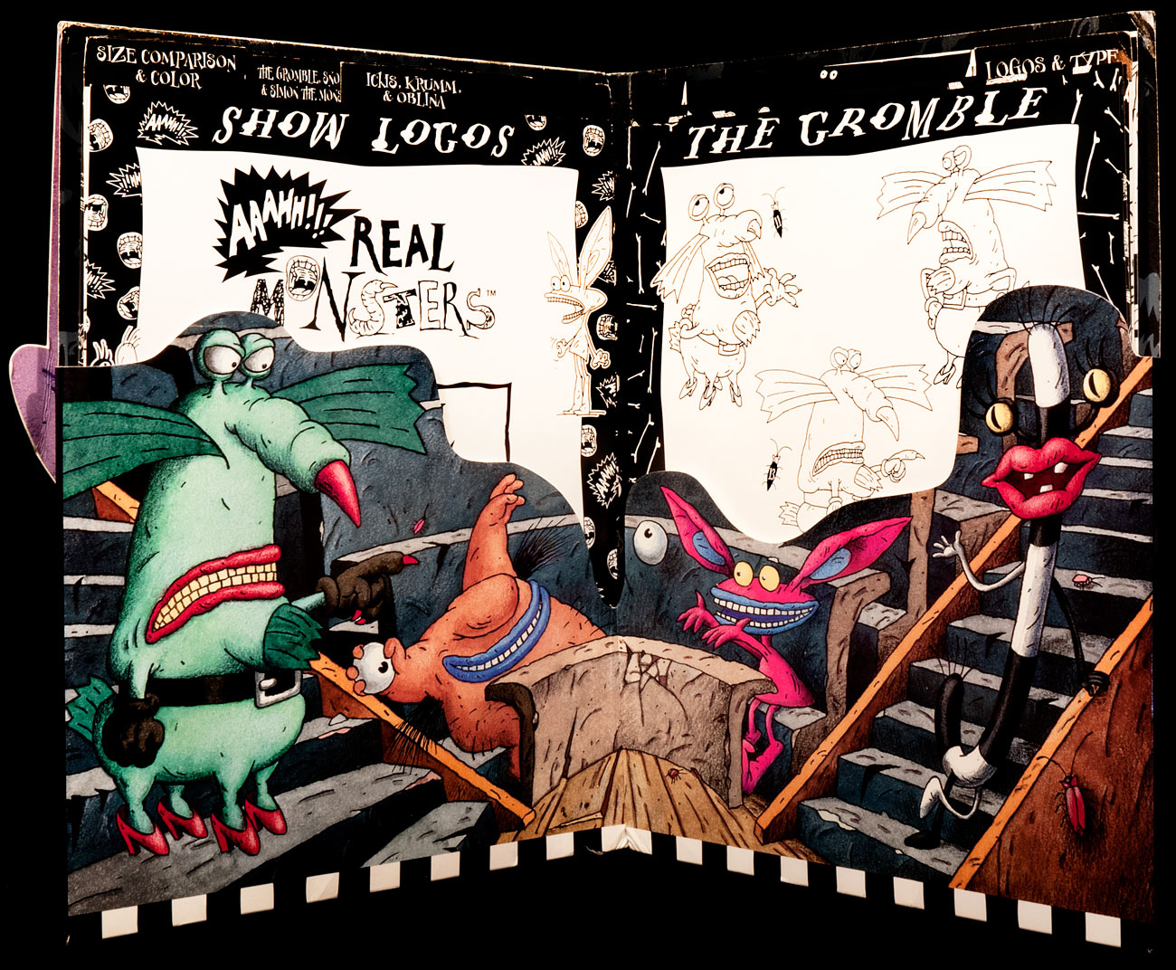 I rather liked the Aaahh!!! Real Monster's styling. The characters were offbeat and original. And they were cleverly designed to be scary, without being scary. Oblina was no more than a walking letter “J” with lips. And Krumm, a blob of naked flesh with hairy armpits, carried his eyeballs in his hands. Everything about the realization was well designed and slick. The style book, below, which I didn’t get until after the fact, was luxurious and impressive. Just click on the cover to lift the flap!