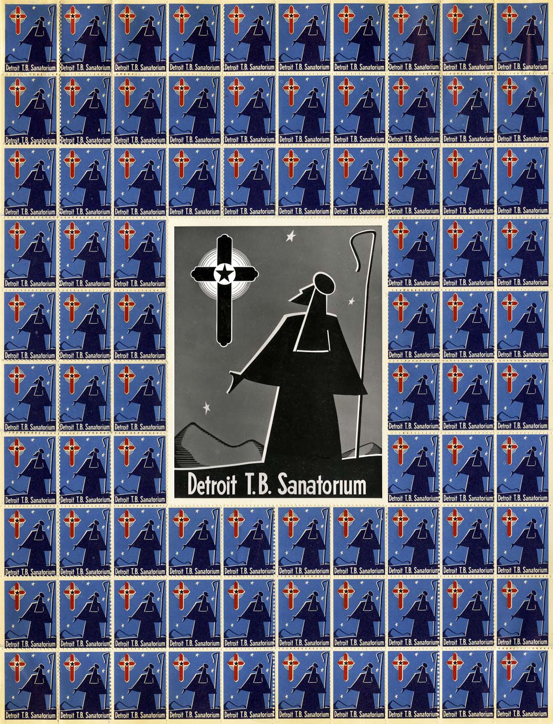 And here is a sheet of the actual Christmas seals, framing a black and white photograph of the design that was shot for the newspaper.