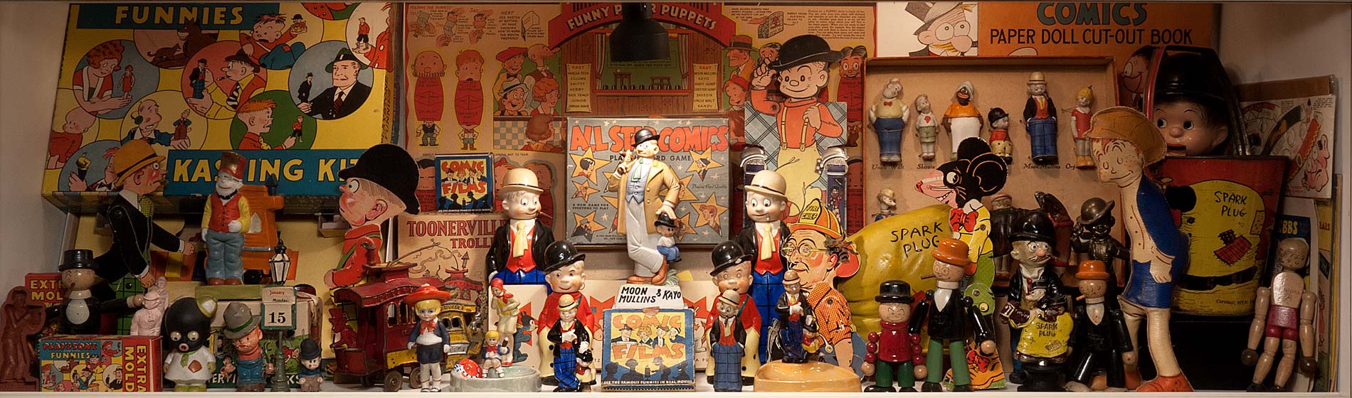 Oh my God! I just realized that I left a whole section out. I didn’t allow a logical place to include it. That place will now be here. So, let’s continue to another showcase upstairs that contains a mixed selection, not especially attractively arranged, of the early funny paper characters.