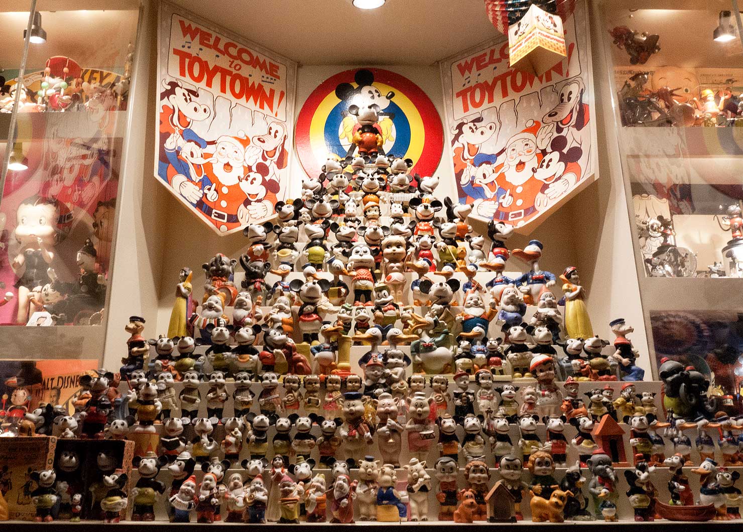 On the very pinnacle I placed this glorious 9” Mickey that was an early landmark on my collecting journey. I found him for the, then, outrageously high sum of $20, a few minutes after my friend Richard Merkin and I snuck into the Madison square Garden Show, in 1967. In the years, since then, mint examples of him have appeared; I let them pass me by. Barring an earthquake, this Mickey will always be top mouse on the pyramid for me.