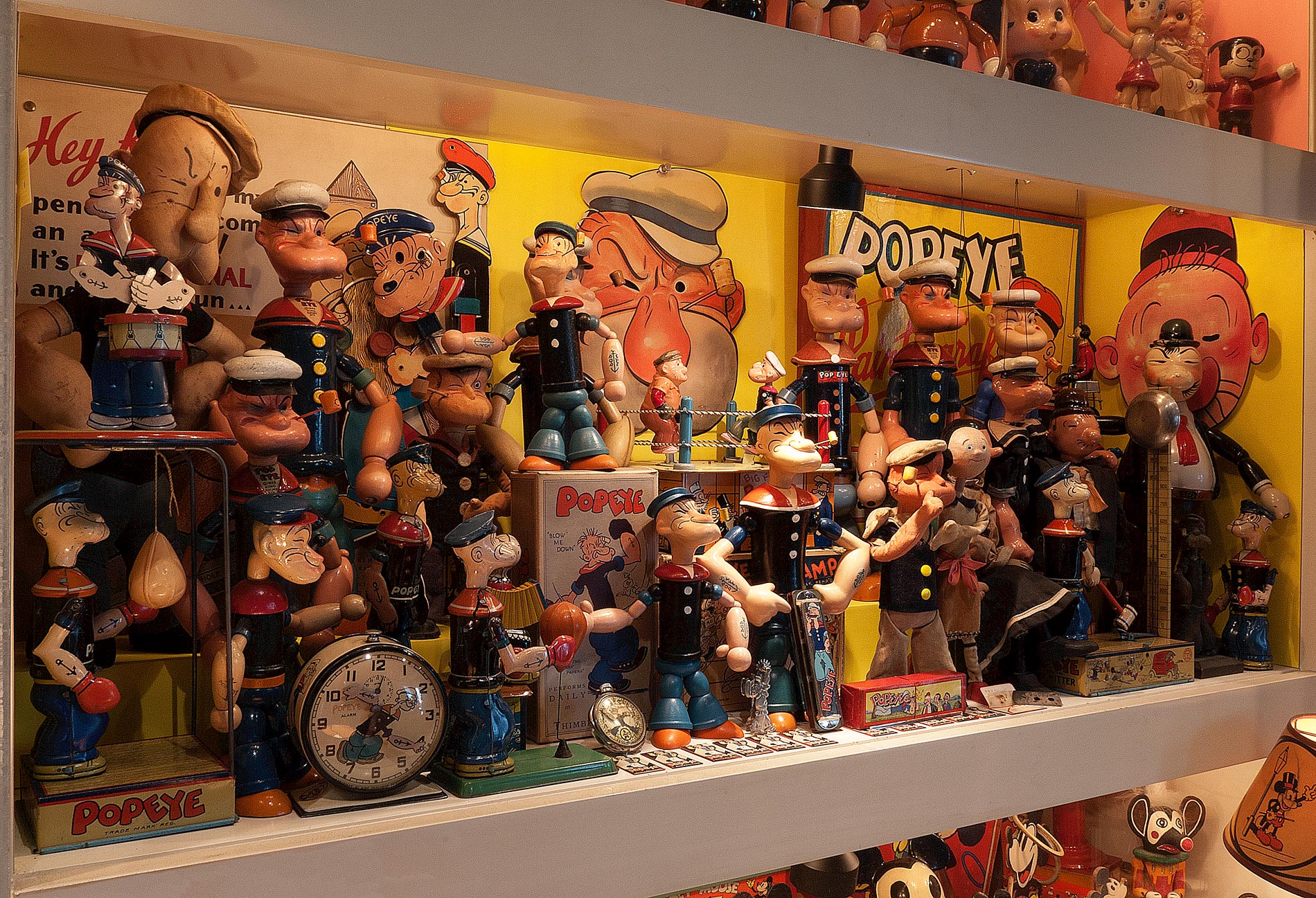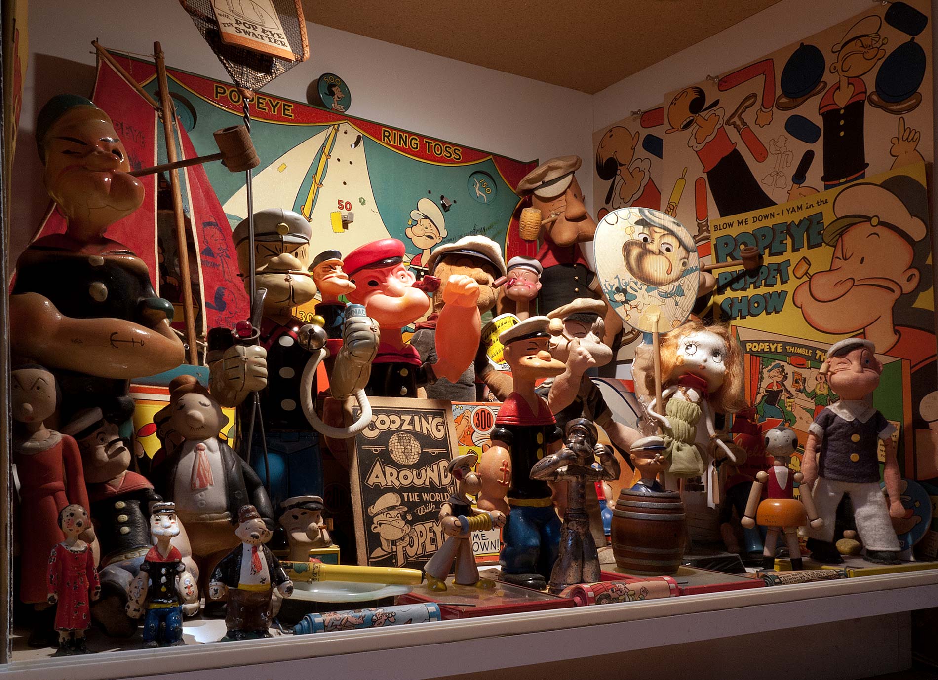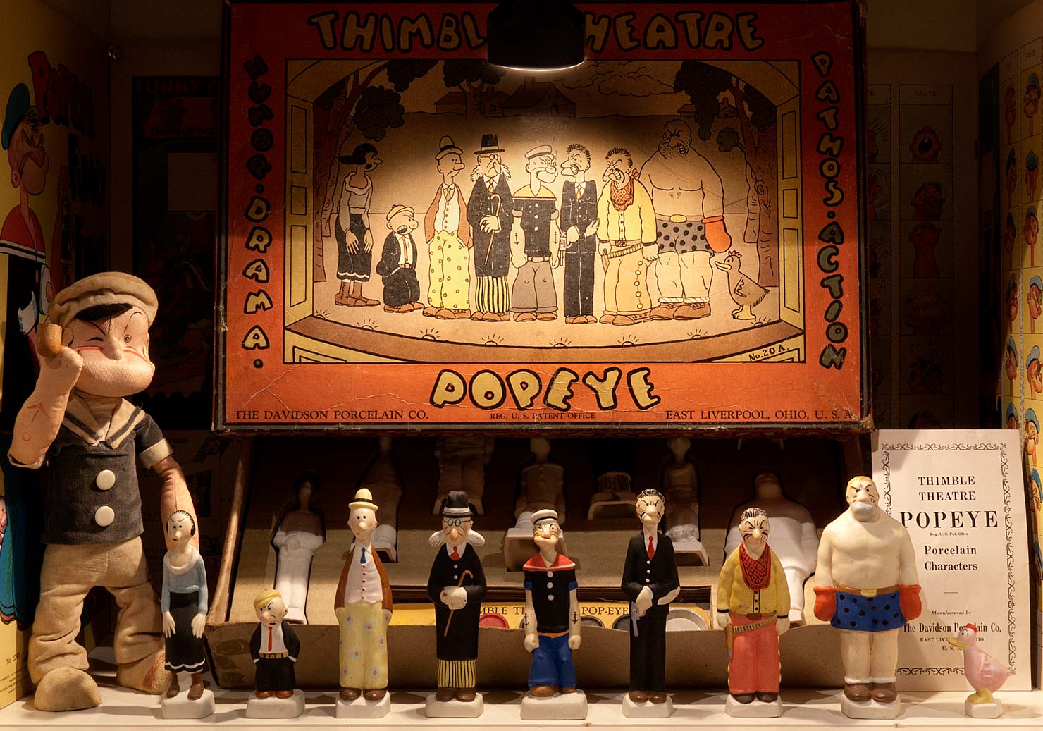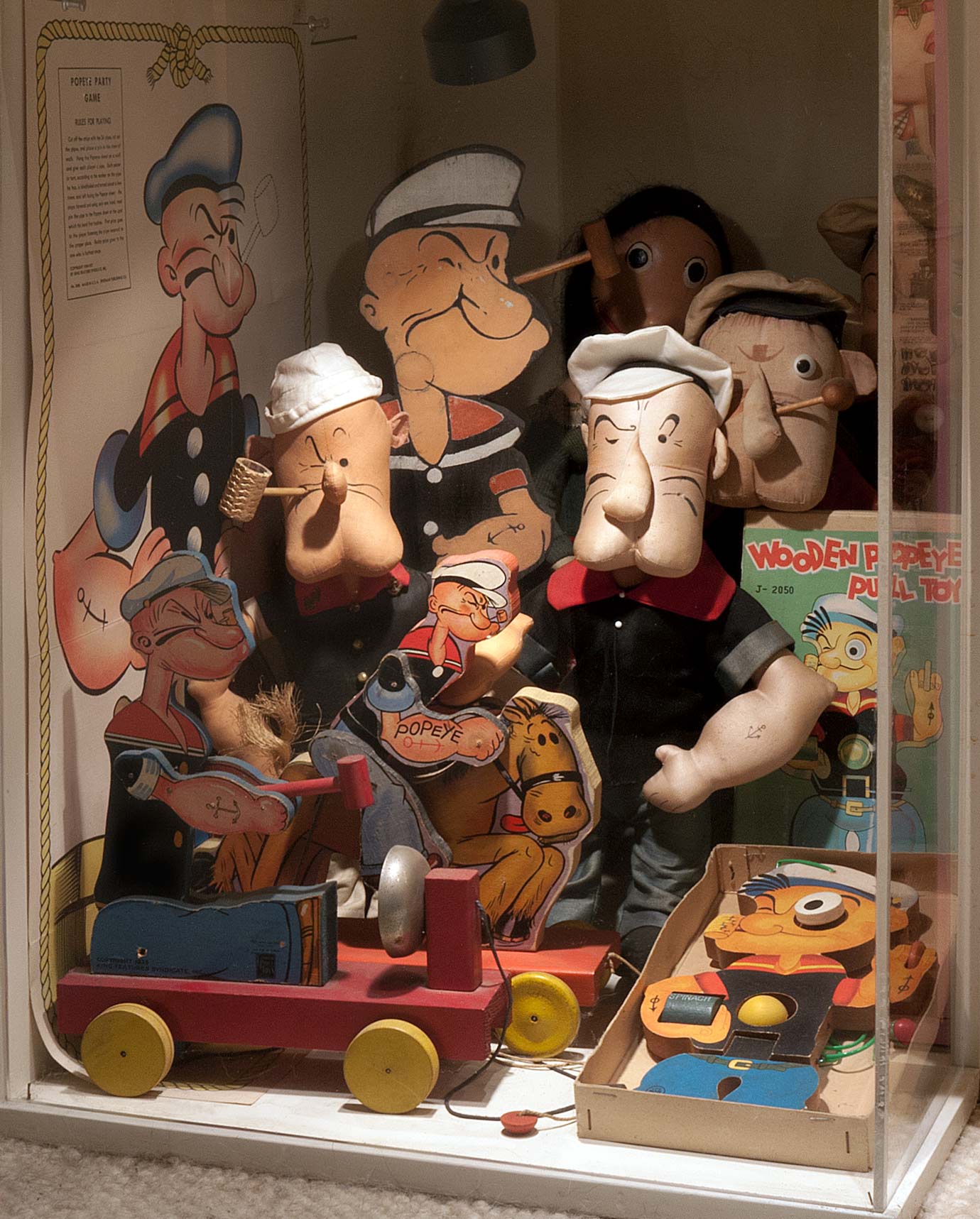This showcase contains the heart of Mouse Heaven's Popeye collection. It's not as Heavenly as that of the Mouse! All the other Popeye cases in the house, and there are several, only exist to hold the things that couldn’t fit in here. The content of this case grew, over the years, until it overflowed and spilled out everywhere. But, for the most part, my favorite Popeye things are here.
