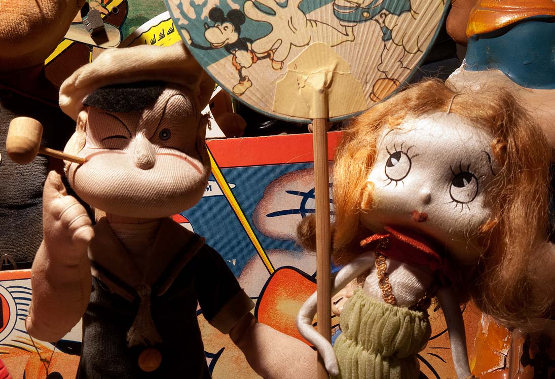 Last but not least, I’m moving in on another favorite, another Popeye doll by Paris Novelty, but this time, while Olive Oyl is still downstairs, Popeye is out with Betty Boop. Oh, by the way, check out that fan that Betty’s holding. Is that Mickey Mouse I see?
