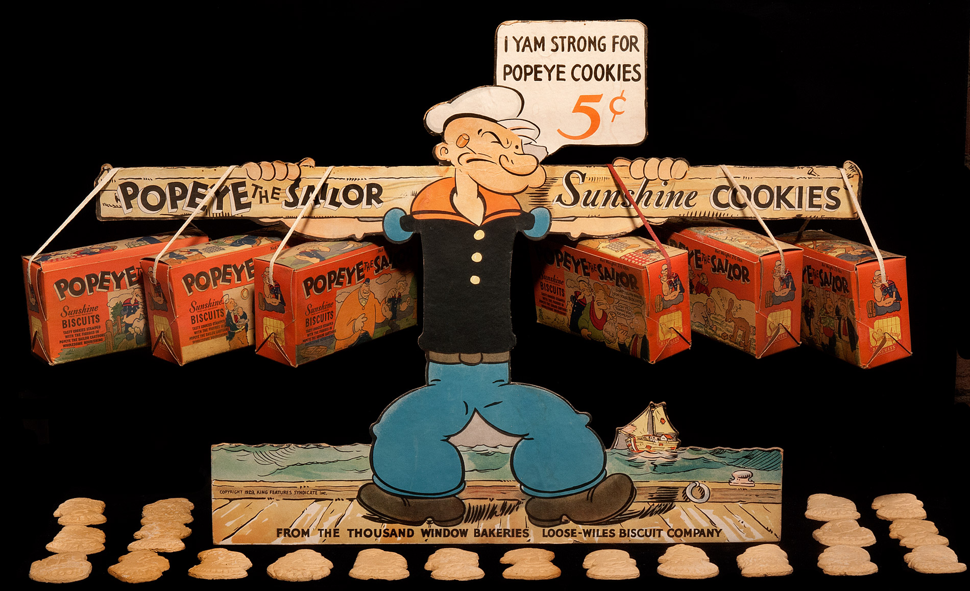 Here, at last, we get to the final Popeye Item, one that seems to impress everyone, this spectacular display for Popeye Sunshine Cookies. Popeye is die cut from heavy cardboard. On his shoulders, he balances a plank. Hanging from this, are six colorful boxes of Popeye Sunshine Biscuits, each one with a different set of images. Everything about this object is original and complete, including the cookies. Each box was full of hundreds of broken pieces, all of the original cookies. Every single crumb was there! They just needed to be reassembled. Would you believe I solved this monumental jigsaw puzzle, using “Crazy Glue?” The cookies continue behind the base of the display, adding up to 26, in all, each different. They portray all the Thimble Theater Characters, from “Alice the Goon” to “Wimpy!” Now, each one is absolutely “Perfik!” And I have become an aficionado on “How the Cookie Crumbles!”