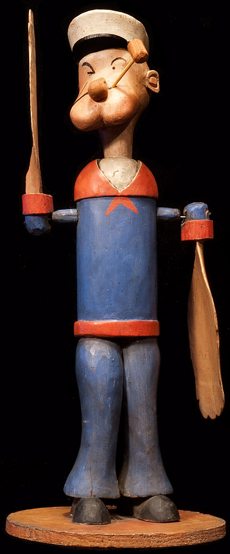 Here are two items, pictured together, simply because they are both tall and thin. On the left, is an oddity that I only encountered one time, in 40 years. Because of its unusual size, I have to believe it might be as rare, as it is unwieldy. This is a punch-out book, in which the front and back cover, themselves, oversized, combine to create a Popeye paper doll, three feet high! On the right, is an elegant folk art whirligig. It is difficultto date this piece, but the bottom of the base displays the evidence of many years, outdoors, rotating in the wind.