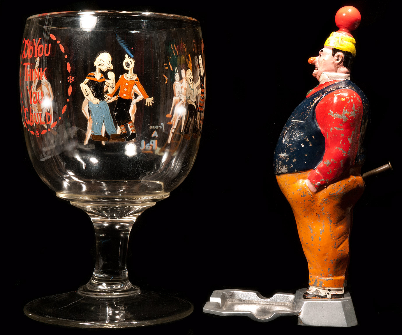 Another folk art object that is related to both Popeye and the putting out fires, Is this huge handsome glass goblet. It was apparently created as a tribute to the “Reading Hose and Fire Company.” Painted on the exterior, we see many of our favorite Comic Characters, Popeye and Olive, Jiggs and Maggie, etc. When viewed from the inside, we encounter the same characters, unencumbered by their clothing.