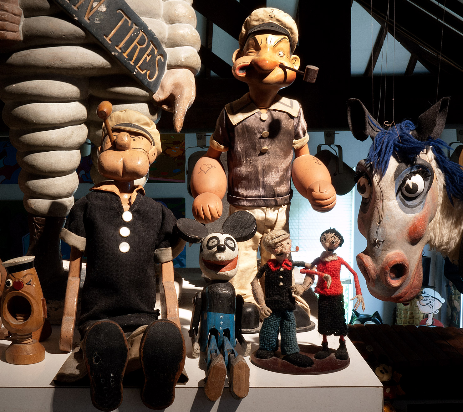 On the platform by the chimney, is an interesting pair of Popeye figures. Both of them are walking toys. The large one, sitting down, was homemade. It is a rather inspired piece of folk art, carved of wood, with clothing that is all original. A rod in Popeye’s back controls the walking motion. The smaller folk art Mickey, next to him, is based on the same principle. The other walking Popeye doll is European. Its concept and construction is complex and interesting. It’s made from a variety of materials: wood, composition, and, inside, there is some intricate machinery. Aided by a helping hand, he toddles along, balancing precariously, not unlike a baby, taking its first steps. His arms and head are animated as well. Europe brought some interesting Popeye items into the collection, but, unlike Mickey, not that many. Here too, is a pair of Popeye and Olive dolls, carefully crocheted, and permanently attached to their base. They were also made in Europe, where handwork, like this, was often considered “manufacturing.”