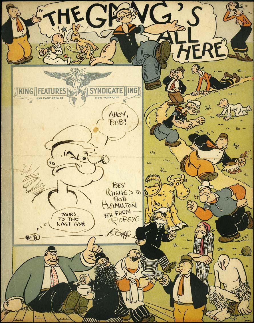Let’s take a break. Here is a pleasant item I don’t want to leave out. It is a delightful sketch of Popeye that Segar drew for a fan named, Bob Hamilton, on a genuine piece of King Features Syndicate stationery. The date is unknown, but the characters shown might offer some clue.