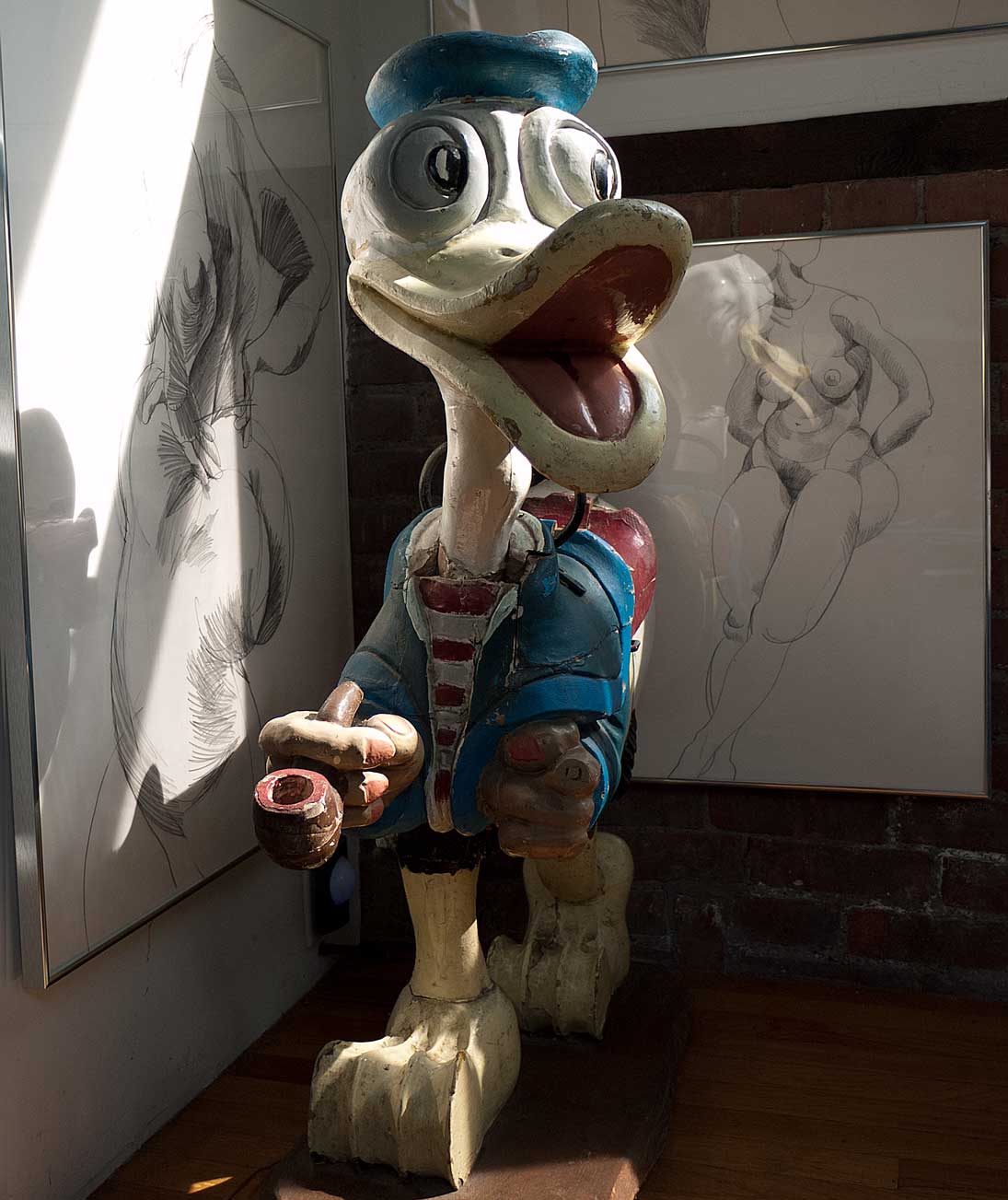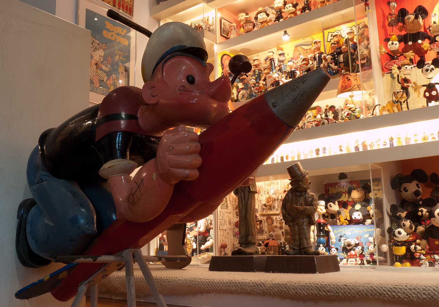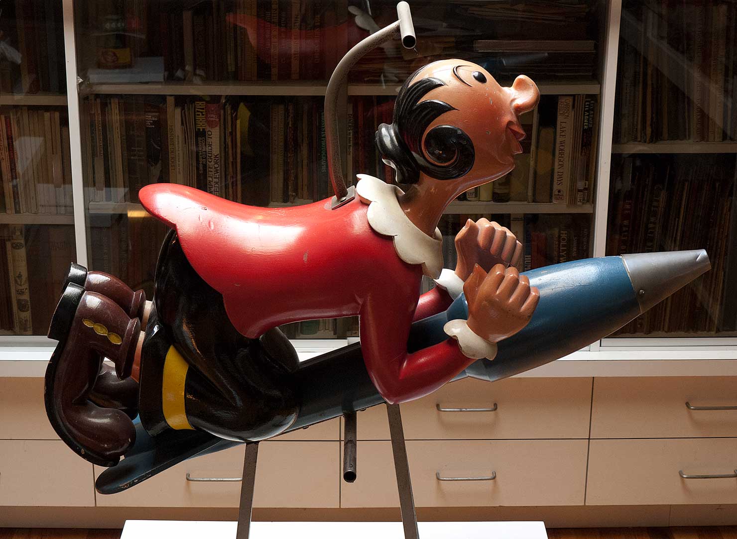 I always preferred this elegant Olive Oyl, to her companion piece downstairs. She rides her rocket, gracefully, beneath the skylight in my studio. And is, apparently, the rarer of the pair. Check out the sweeping curvature of her back, the lyrical bending of her knees, echoed by the soles of her enormous feet, the flamboyant flourish of her hair. Even the metal handle curves curvaceously. This is an exquisite sculpture, sensuously stylized and sophisticated, voluptuously realized in wood. Even in her "Reel Life", Olive never looked this good!