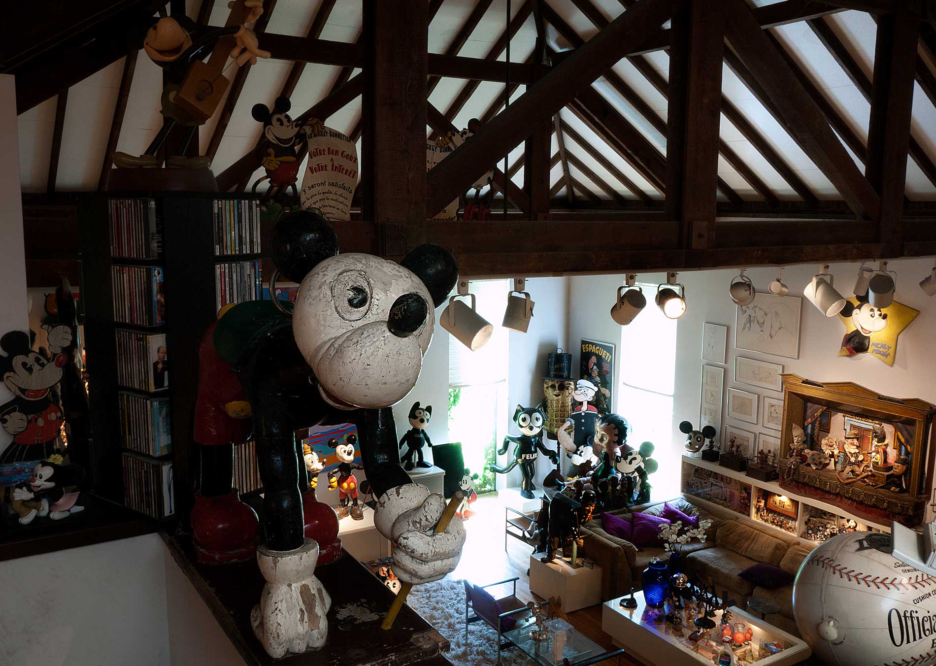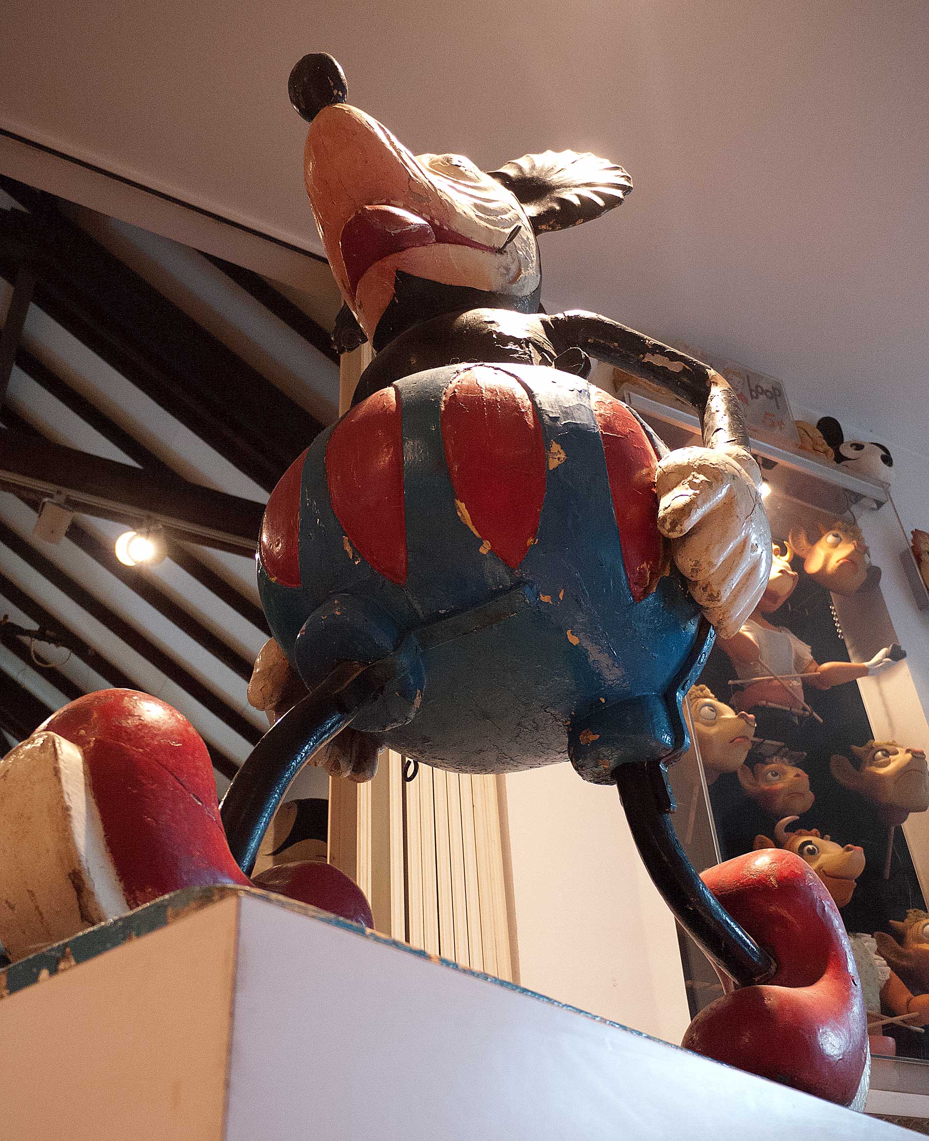 The rest of the carousel figures you are about to see are all from France. There are two Mickeys, bending over. They are intended to carry a single rider. The styling is obviously the same as the pair of standing figures that appeared at Bambergers. They might even have come from the same carousel. One is perched on the balcony wall, beside the stereo.