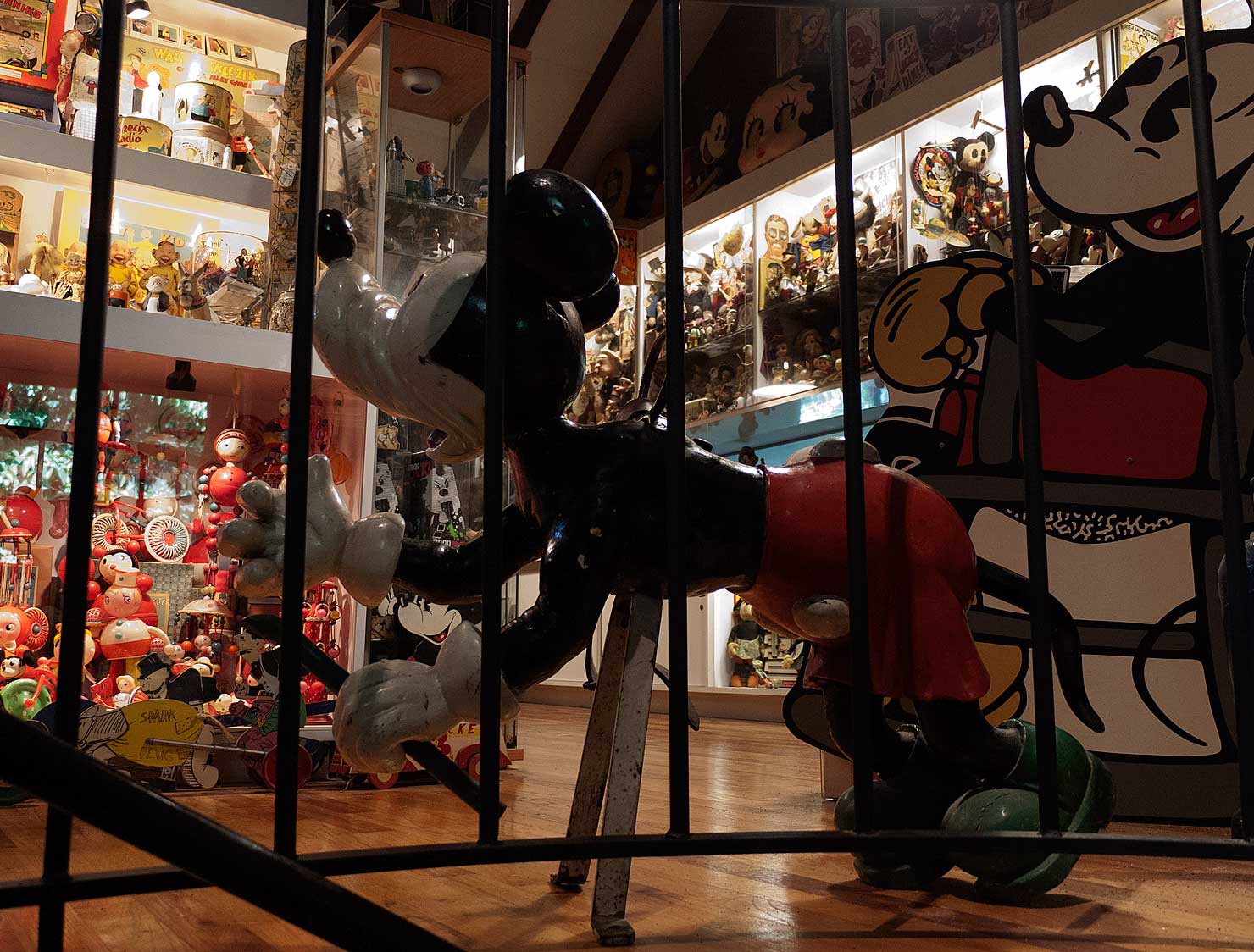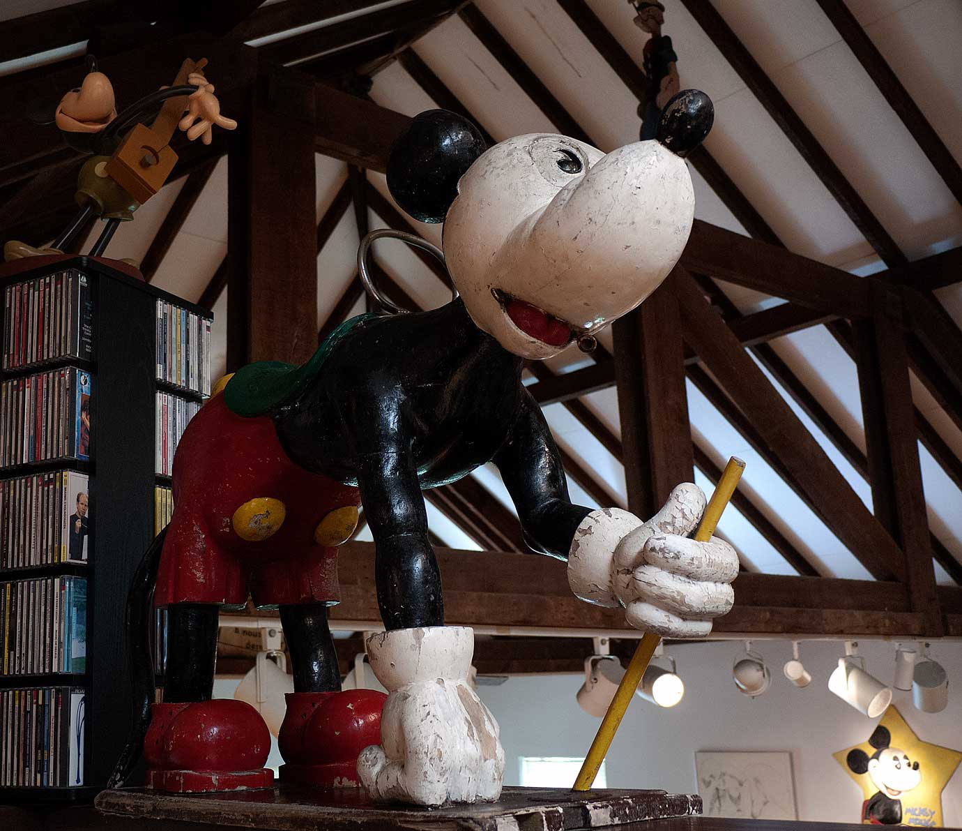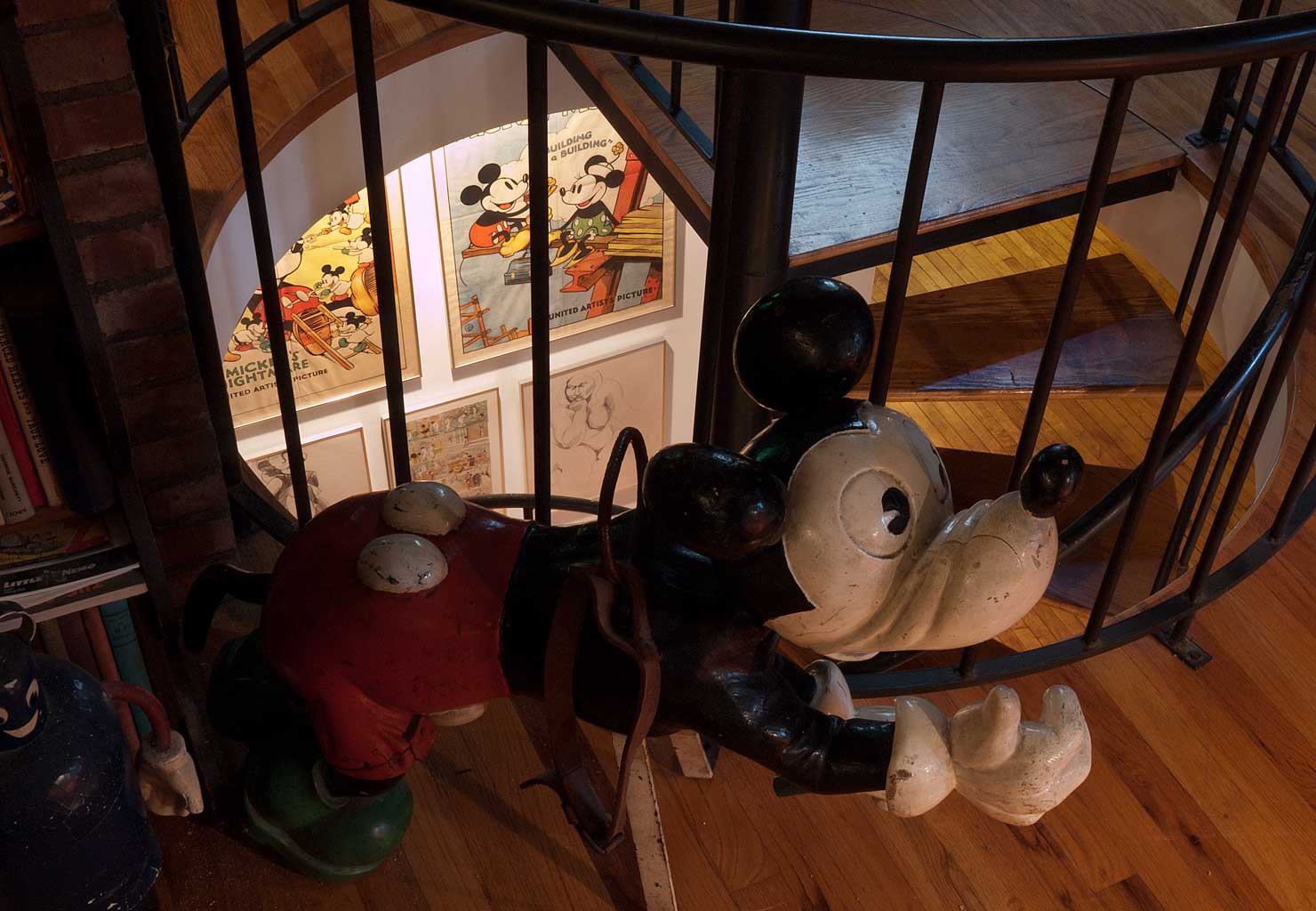 The second Mickey is tucked in, beside the spiral staircase, waiting, in the dark at the top of the stairs, for someone to ascend, and turn on all the lights, up there.