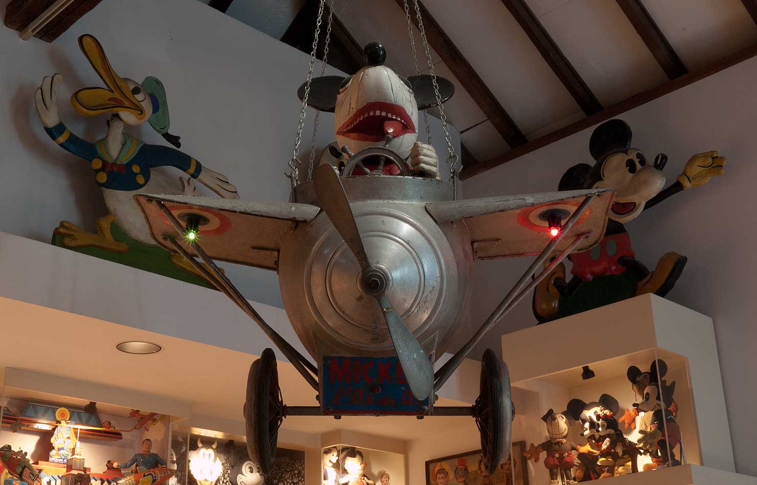 Flying over the Great Hall, is Mickey in an airplane. The coded message on his license plate translates to read "The Ace of Aces." I have this wired to the stereo, so that the wing lights illuminate when it is played. They’re on a lot, all day! In the sky beyond him we get a preview peek at some Old King Cole Displays.