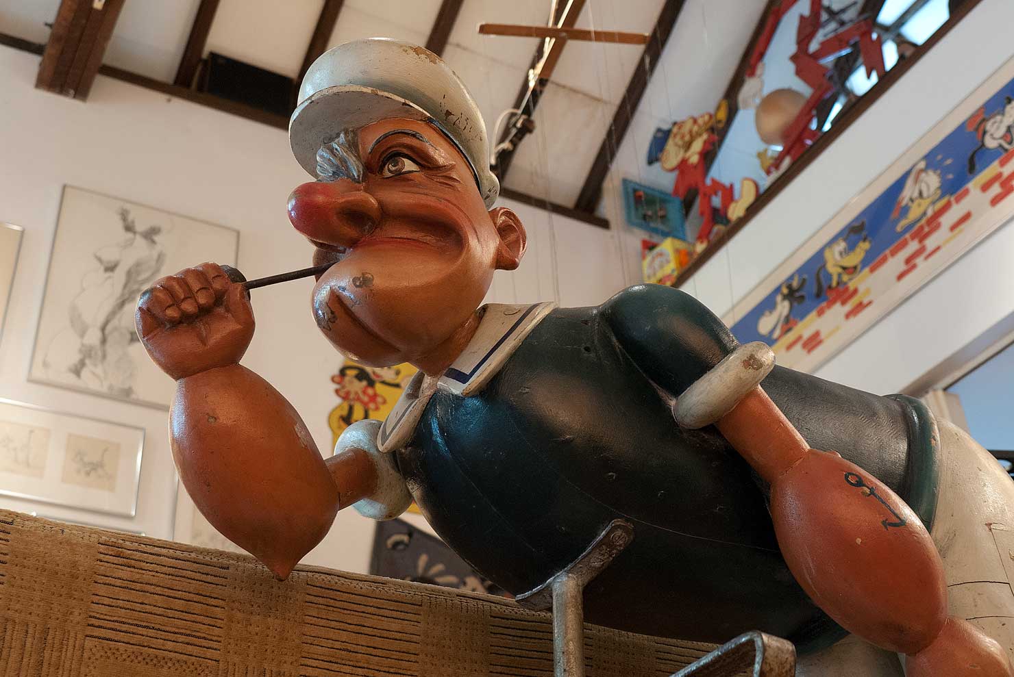 Charlie came from a carousel in Belgium. Possibly, by the same carver as this rather serious looking Popeye. Charlie was in incredible condition when I got him. He has never been repainted. This is unusual, unheard of really, most carousel figures got a new coat of paint, every year. And with each coat, a chapter in its history was covered over. This can be, either horrible, or attractive. In Popeye’s case, it was a disaster. Beneath one ugly color after another, the real Popeye was hiding. Every time I looked at him, he bugged me, and begged me, to set him free.
