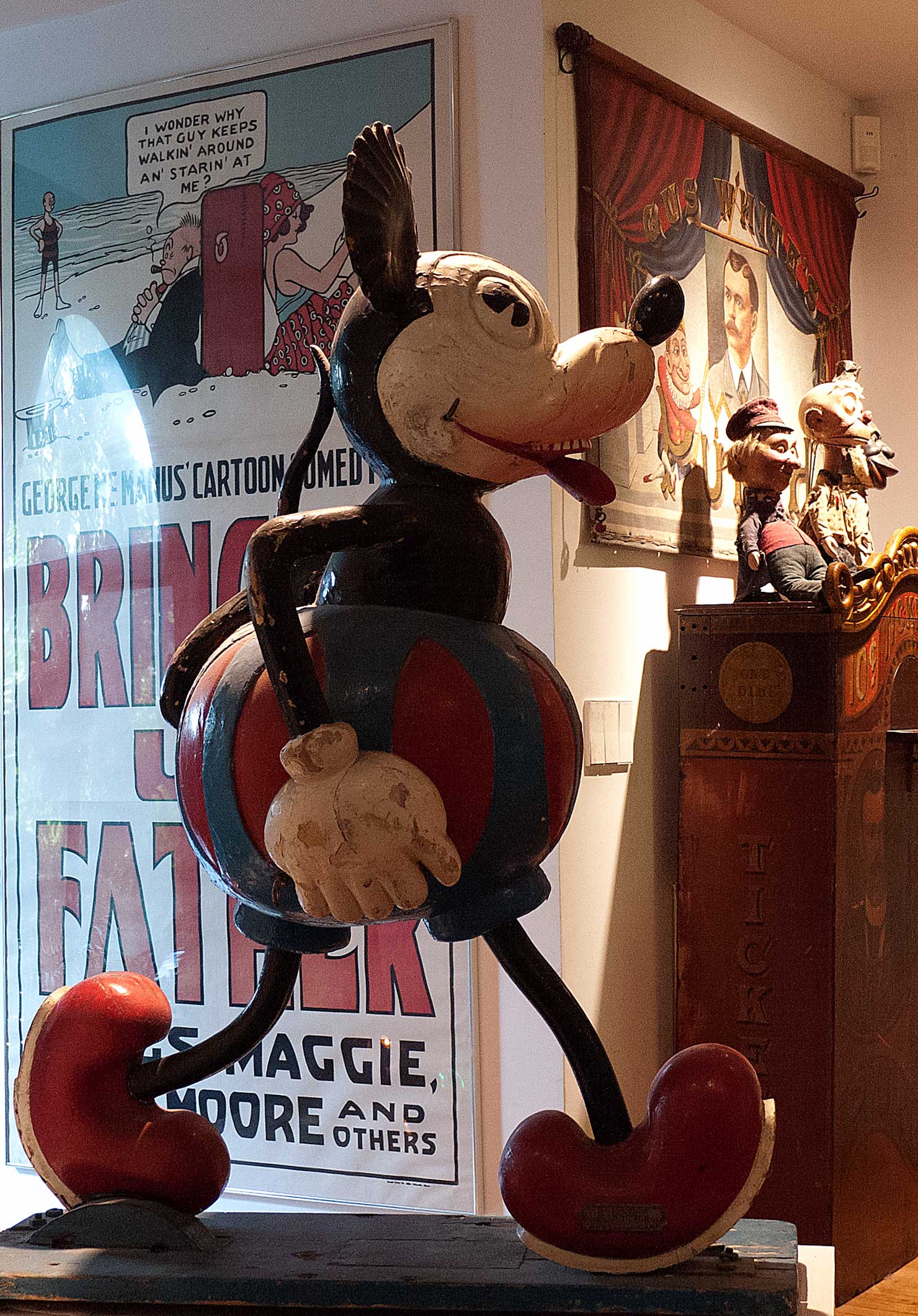 And Now, the Best Carousel Figure of all! Pierre bid on this for me in a French auction. He is all original. Some of his many coats of paint are flaking, and he was much better looking when I got him, but I am not touching anything. Like me, he is deteriorating. We are both hanging on together. He was actually cut right out of the carousel. A portion of the original floor, itself, including the wheel housing, is still firmly attached to his feet. When mounted on the carousel, Mickey would have been pulling a cart or rickshaw, with a passenger in the seat.