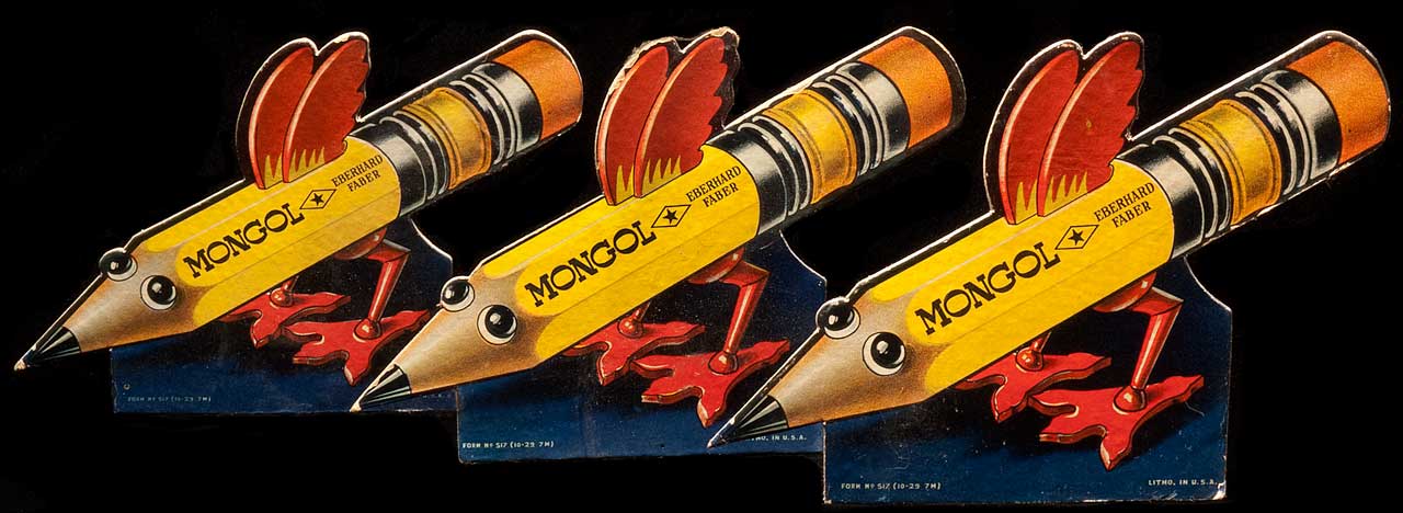 One more object that falls into the category of “Readymade”, as an extraordinary Work of Art, ready to go, is this gratifying object that depicts a “Mongol” pencil. This advertising symbol is intriguing. I first encountered it in the form of this simple cardboard fold out. The repeated image is eye-catching. But fully realized in 3 Dimensions, the effect is dramatic.