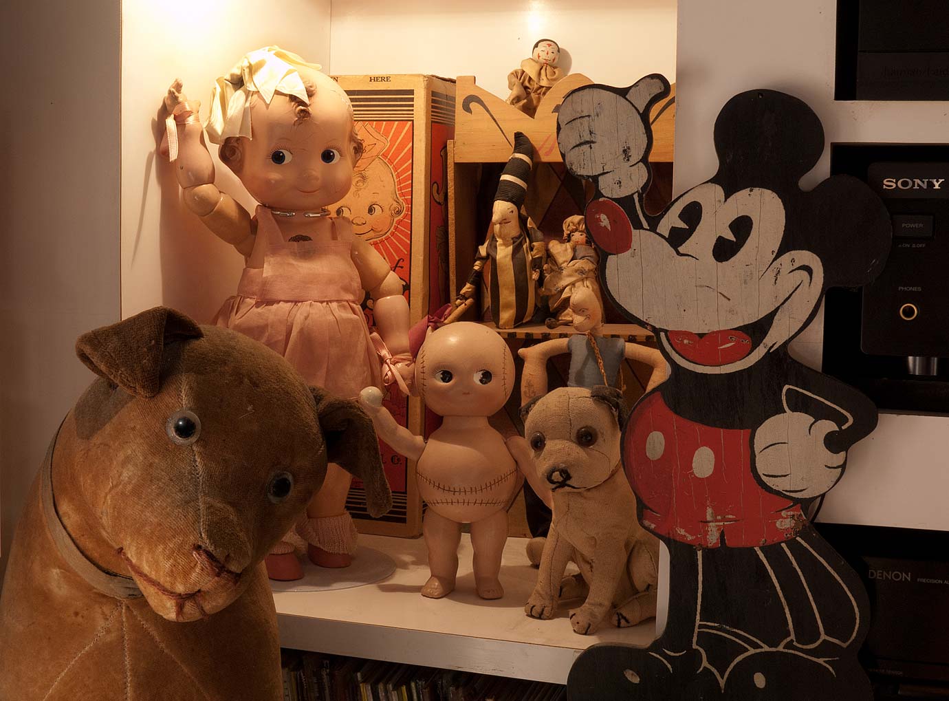 He sits beside the stereo, a link between the first talking machine and my own monument to 1950s technology. This equipment , especially the huge speakers, downstairs, are 45 years old. They still sound great, today. Oh, here, also, is a Joseph Kallus' doll called, Joy, in her original box. She is a joy to see. Here too is a small stray, who looks a lot like “Victor's” pup to me. And a rarity that I advertised for for years, and never saw, except this one, "The Baseball Doll."