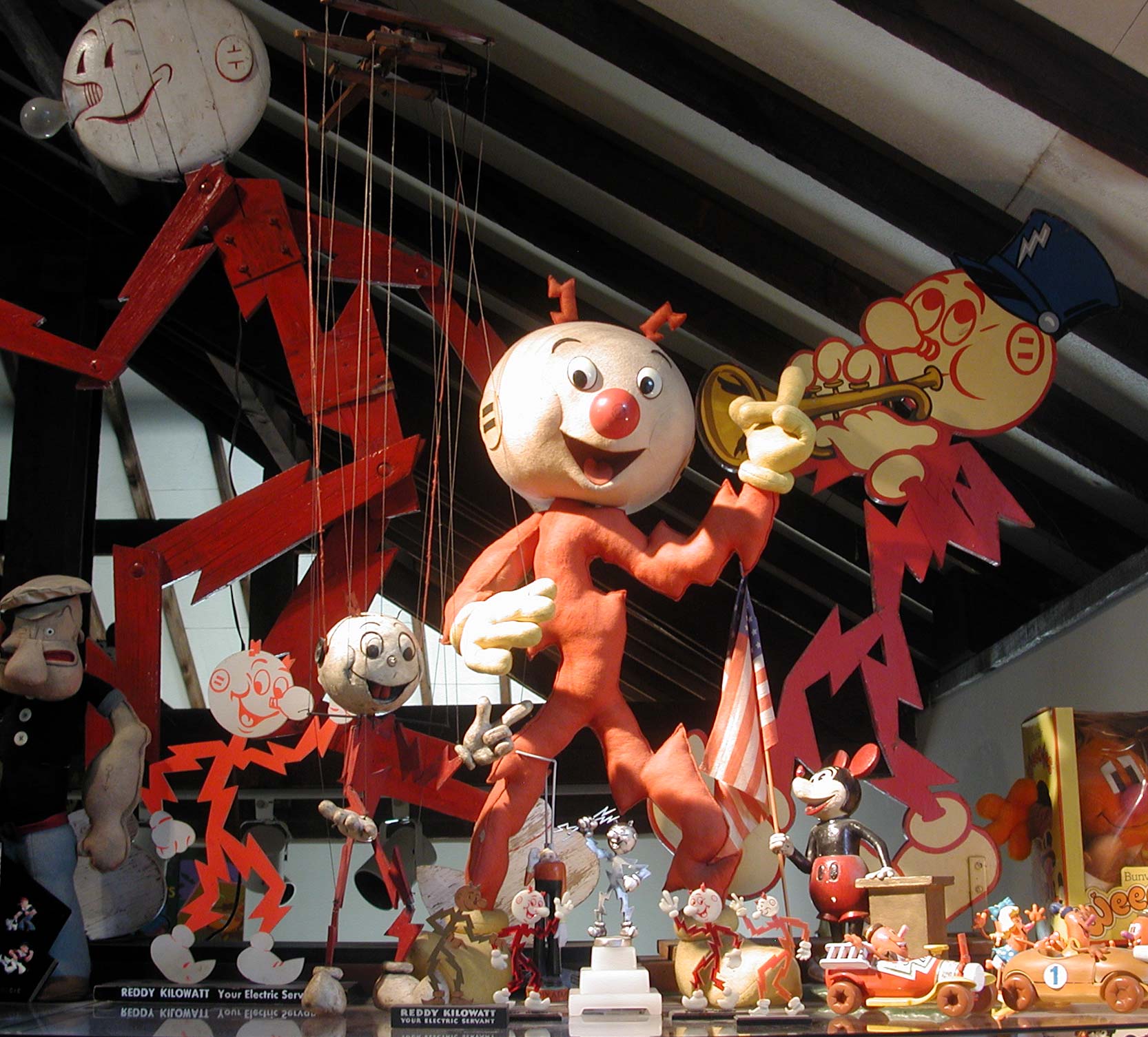 Next is Reddy Kilowatt. I could kill for some of these. This is the small accumulation or Reddys that came my way, over the years. Some were exciting, even, Electrifying, and some were just OK. In the back, is a huge wood jointed display. This has been “electrified” with a light bulb for a nose. I wonder how he’ll look with one of those newfangled spirals?