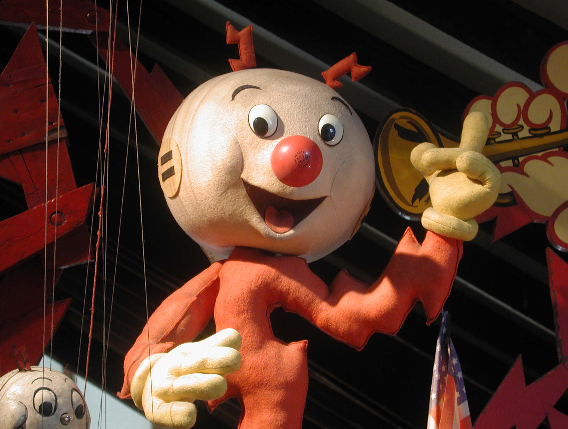 This marionette is unique. He is obviously one of a kind, and absolutely fabulous! His nose, too, is wired for electricity. A battery pack is incorporated into his controller that makes his nose light up. The power travels down those two fat red “strings.” I am still looking for one of those big red light bulbs to replace the one that’s there, the kind that they used to use on the transformers of Lionel trains.