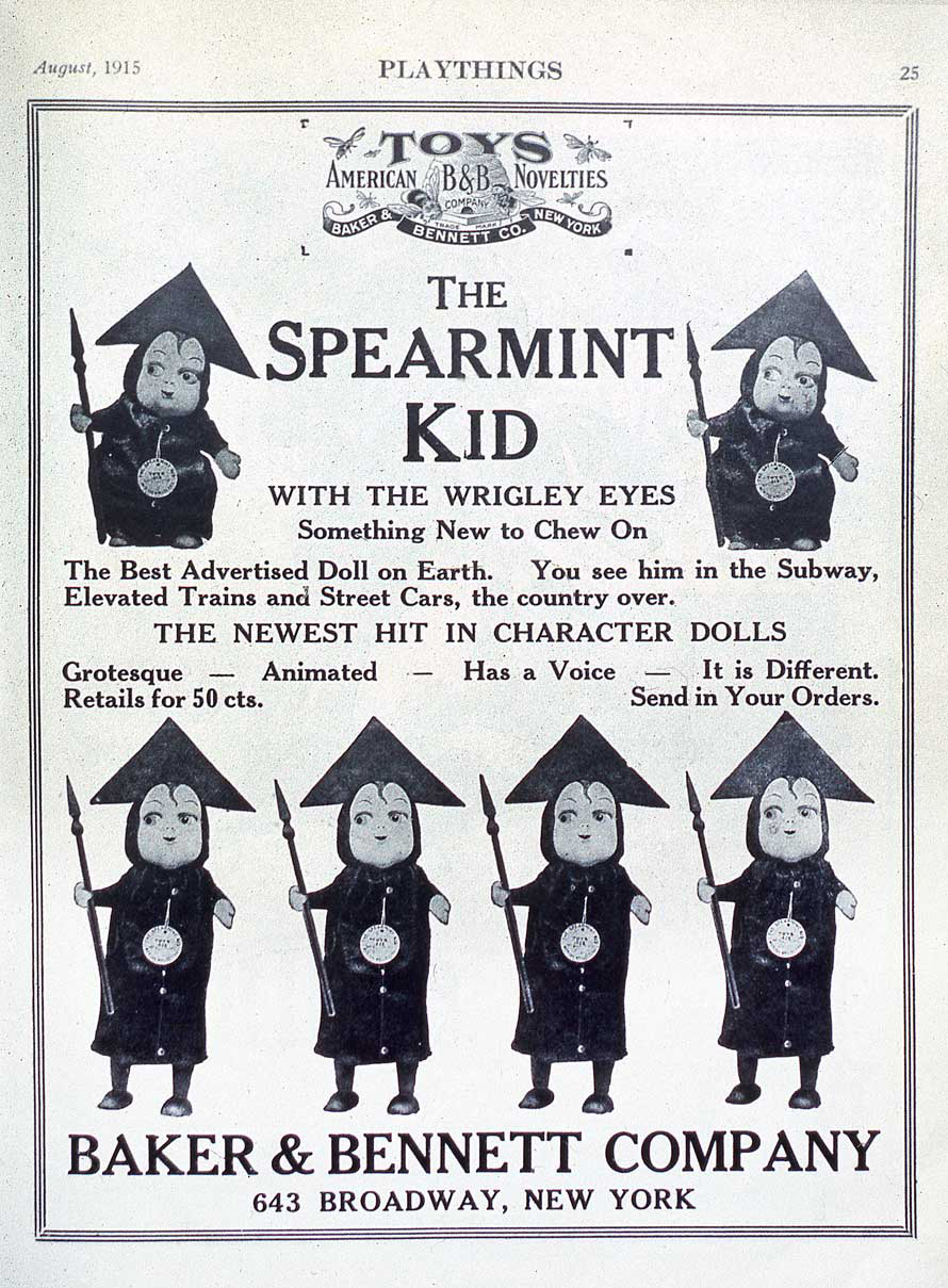 A few Advertising oddities remain. Although, the category was not my thing, many characters and objects transcended that lack of enthusiasm, and moved in. I must confess that I have a thing for these really early dolls of the Spearmint Kid. There’s one in the case above, and two elsewhere. Here is the ad in Playthings magazine that announced them, in 1915.