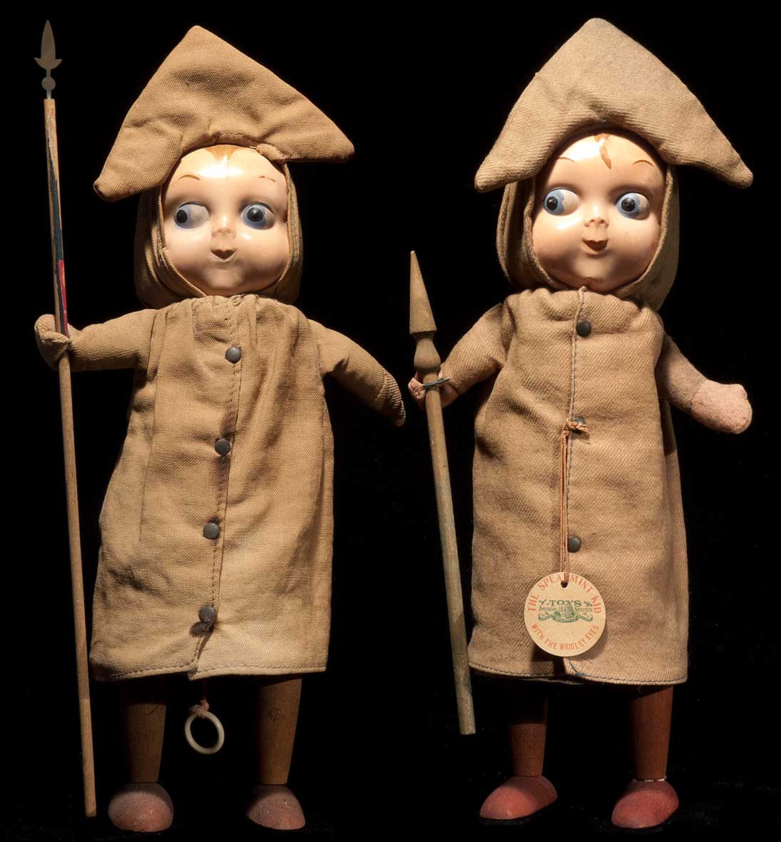 And here are two examples, one with the original spear. They fold up like an accordion, and, at one time, squeaked. They have a spring inside to make them pop up again. And, according to the ad, they have “Wrigley Eyes!” One has the original hang-tag. The other carries a pole with the remnants of what was, apparently, some sort of flag. Both have staffs with lethal points. The Kid on the left has a pull string with a celluloid ring that makes him do his thing. Their faces, too, are celluloid. The color green has faded, long ago, from every one of these that I have ever seen, which in total, is three, all of which are here with me.