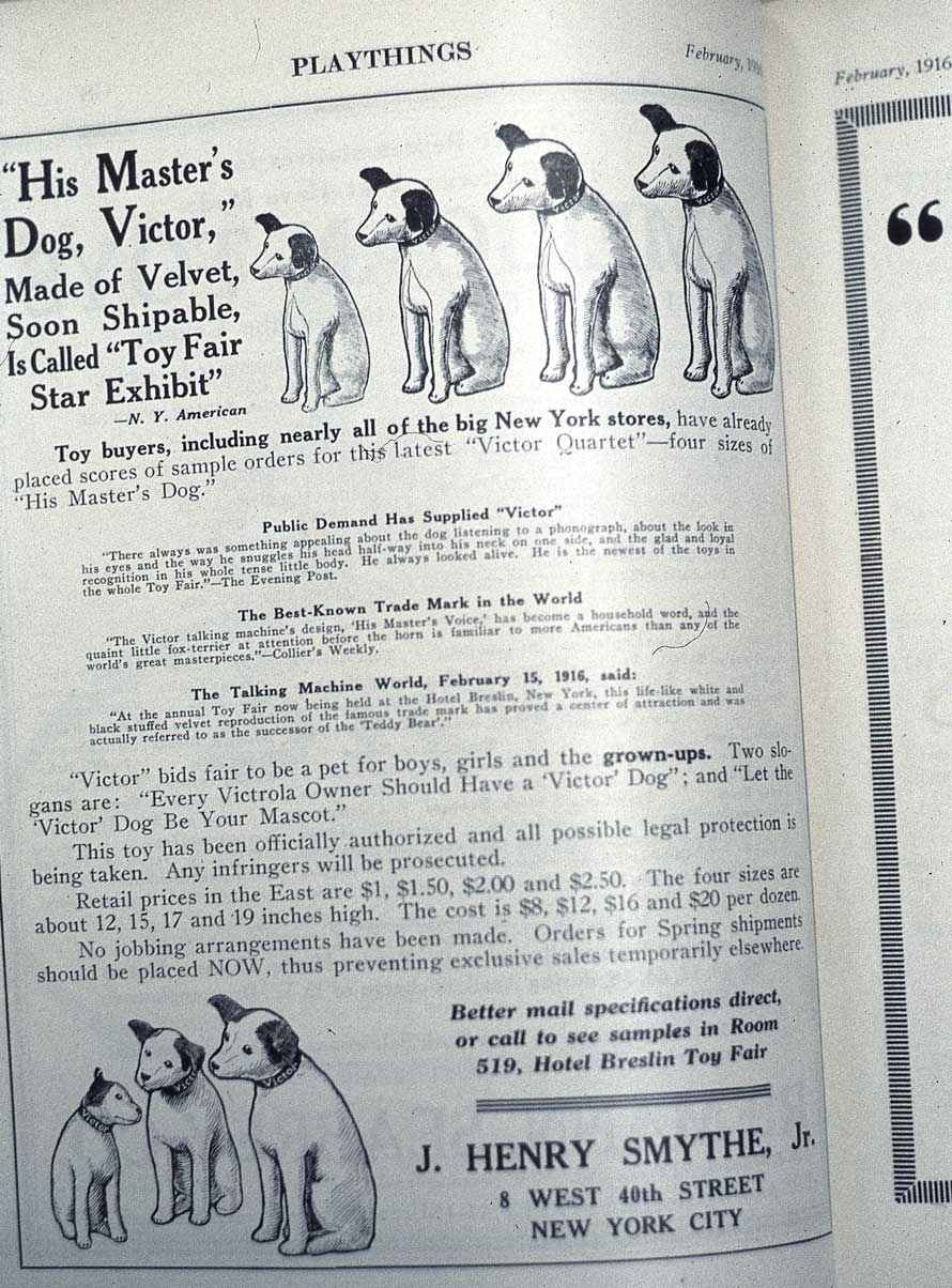 Here is an oddity I'm pretty sure is rare. This is the original ad, as it appeared in Playthihgs Magazine in 1916, “His Masters Voice Dog, Victor”. The ad sure goes into a lot of details, complete with testimonials. But, in spite of all its excess explanations, it still isn’t clear if this doll was licensed from RCA Victor, or not.