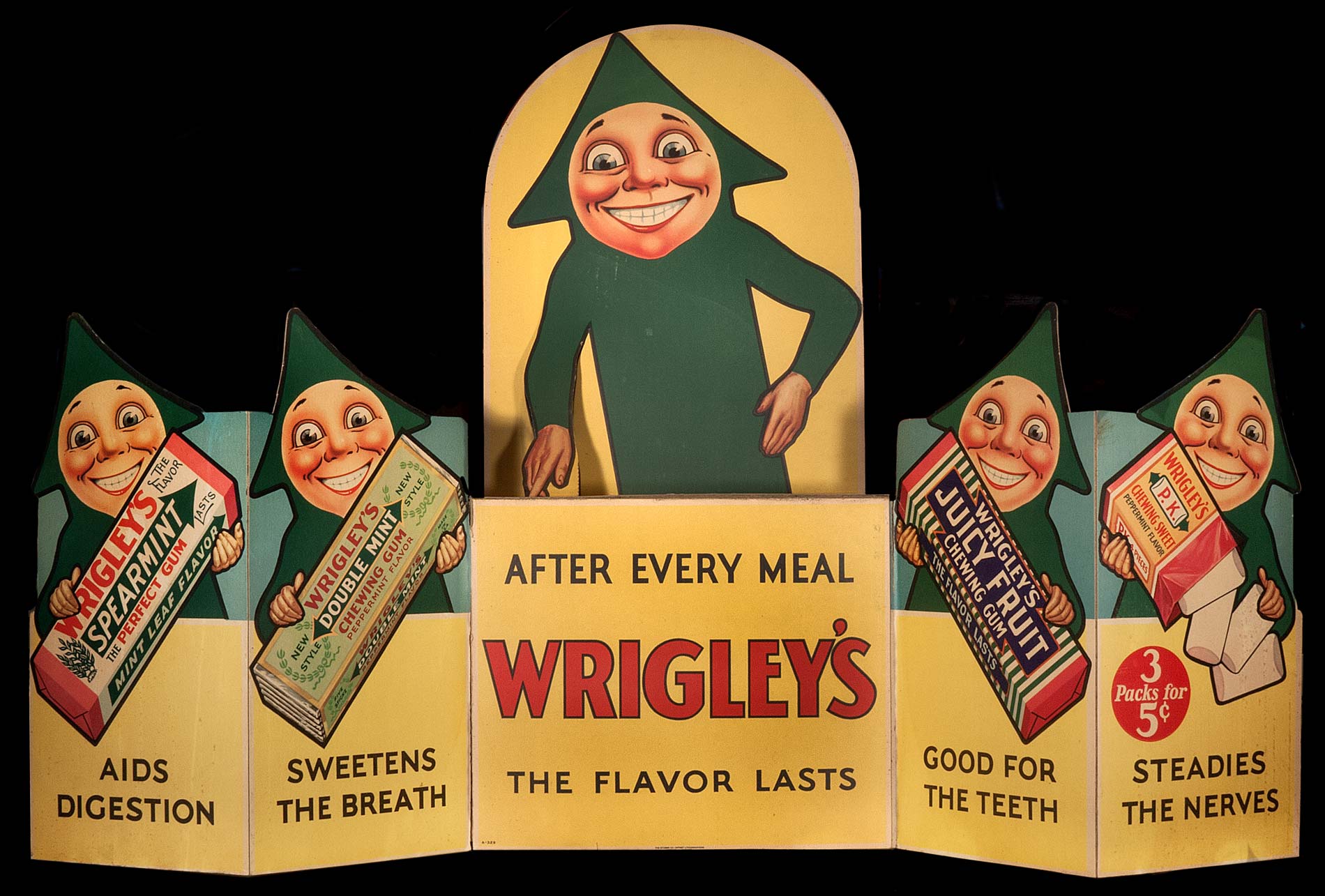 This stand-up display is, in itself, an impressive and complex piece of paper engineering. A full four feet wide, it all folds up. Each corner, where the folds meet, has a tiny hole to relieve stress. The Barkers head is a separate piece that fits into an envelope, affixed to the back, and then rests in a pocket, fashioned in his collar, to hold his neck.
