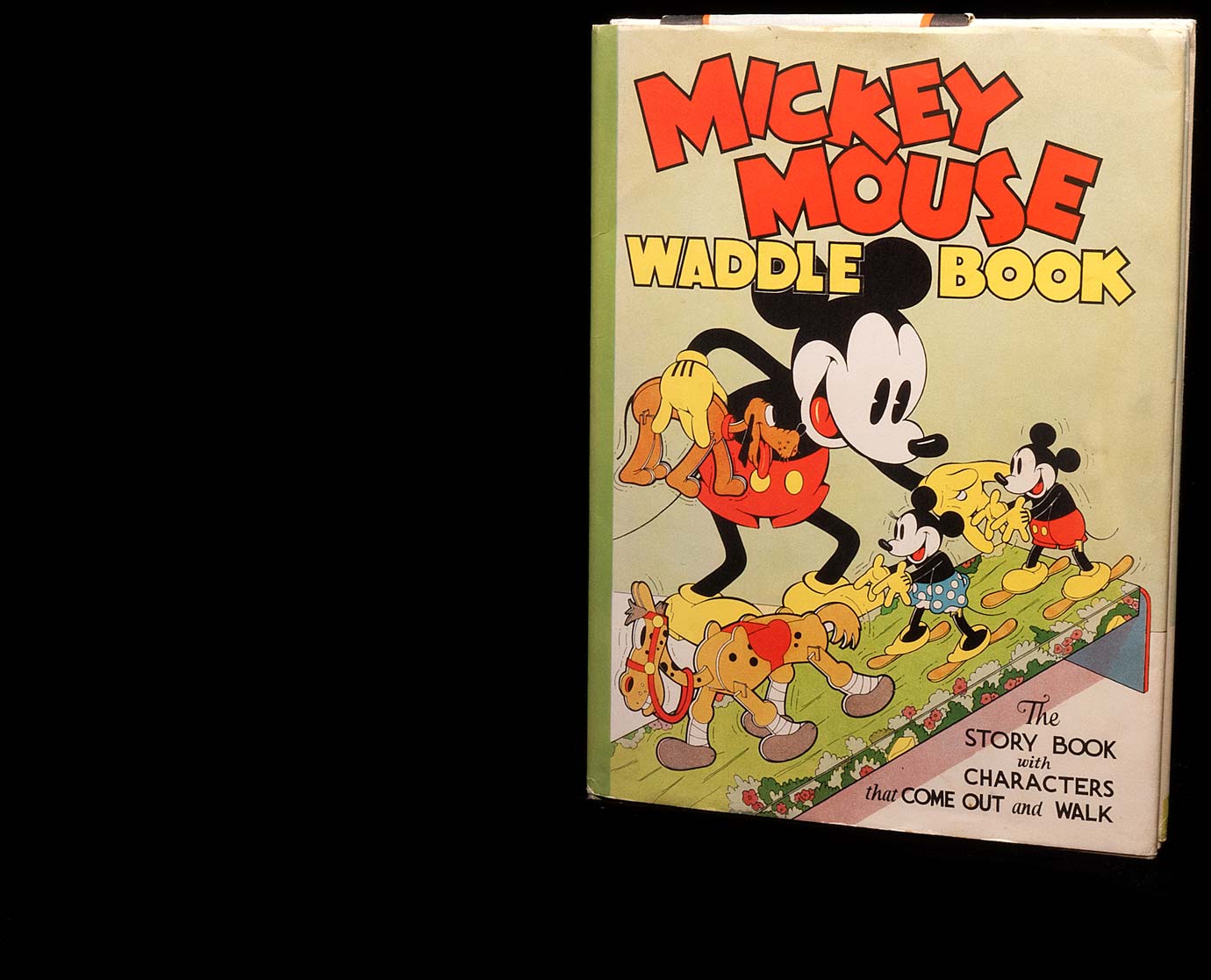 So what is it that is so alluring about this most Amazing book? Well the blurb on the cover says it all! It is “The Story Book with Characters that Come Out and Walk!” The copy inside the Dust Jacket goes on to explain: “This NEW MICKEY MOUSE WADDLE BOOK uses for the first time in the history of book-making a marvelous new invention (fully protected by patent applications), which gives to children a book with characters that walk. These animated three-dimensional figures come right out of the pages and, without the use of springs, or rubber bands, or delicate contrivances, walk with a fidelity to life which will delight any child.” I couldn’t have said it any better, myself!