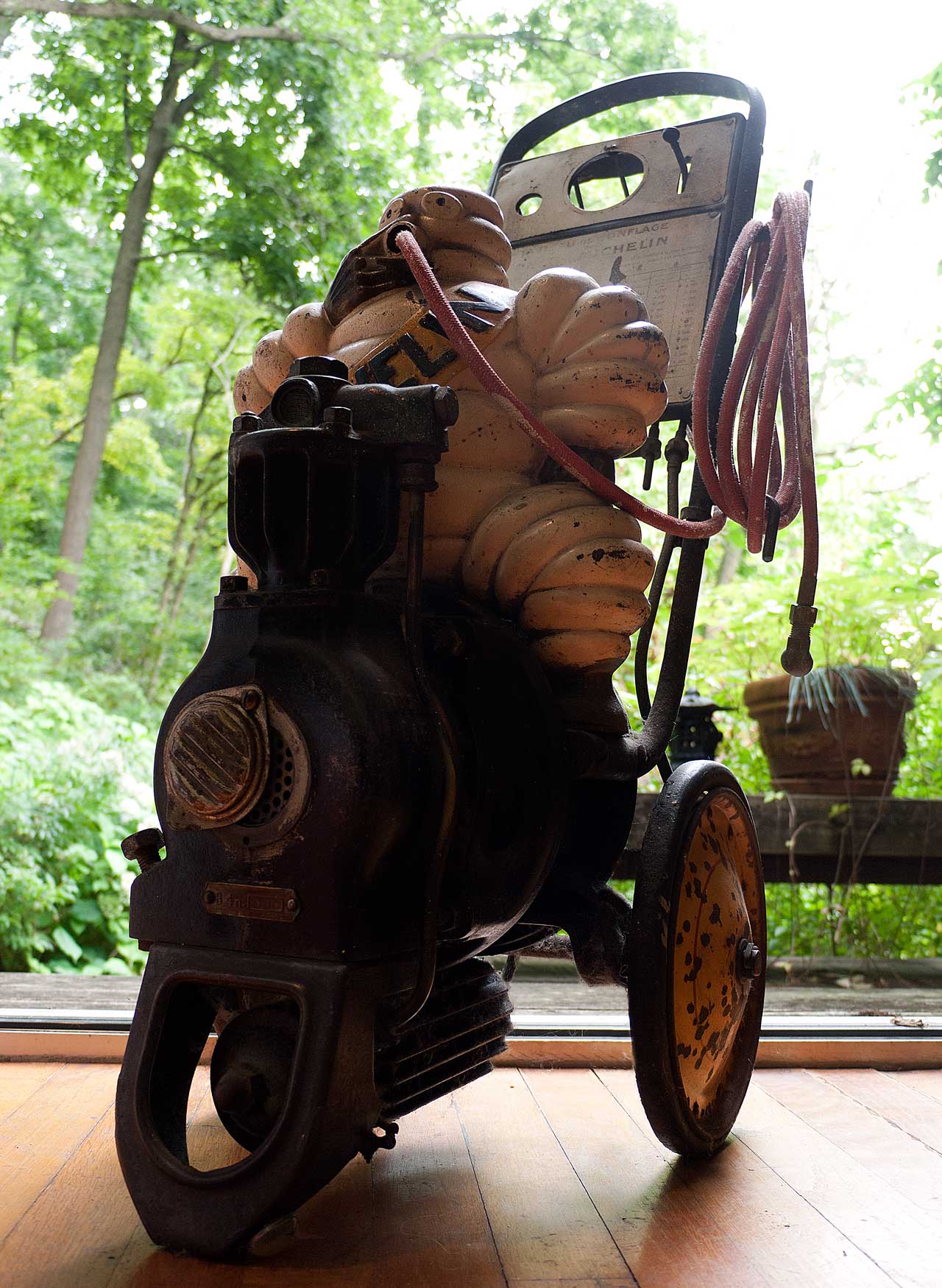 And here is the companion piece to the small tire pump, with which my interest in the Michelin Tire Man began. It too was imported from France, As an object it is, somewhat, more industrial than sculptural, but, nonetheless, it has a certain complex charm. And the large figure of Bibendum is, once again, made of cast iron.
