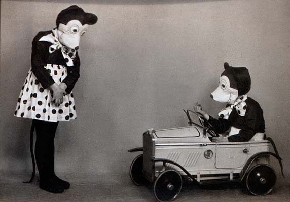 Here are two Mickeys (a small peek of a fifth ear reveals the fact that there are, actually, at least, three). They cross that line, into the world of scary. They were photographed on a Paris Street in the early 1930s.
