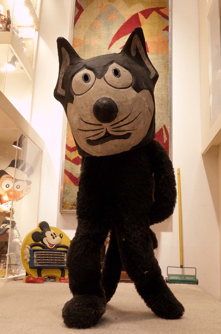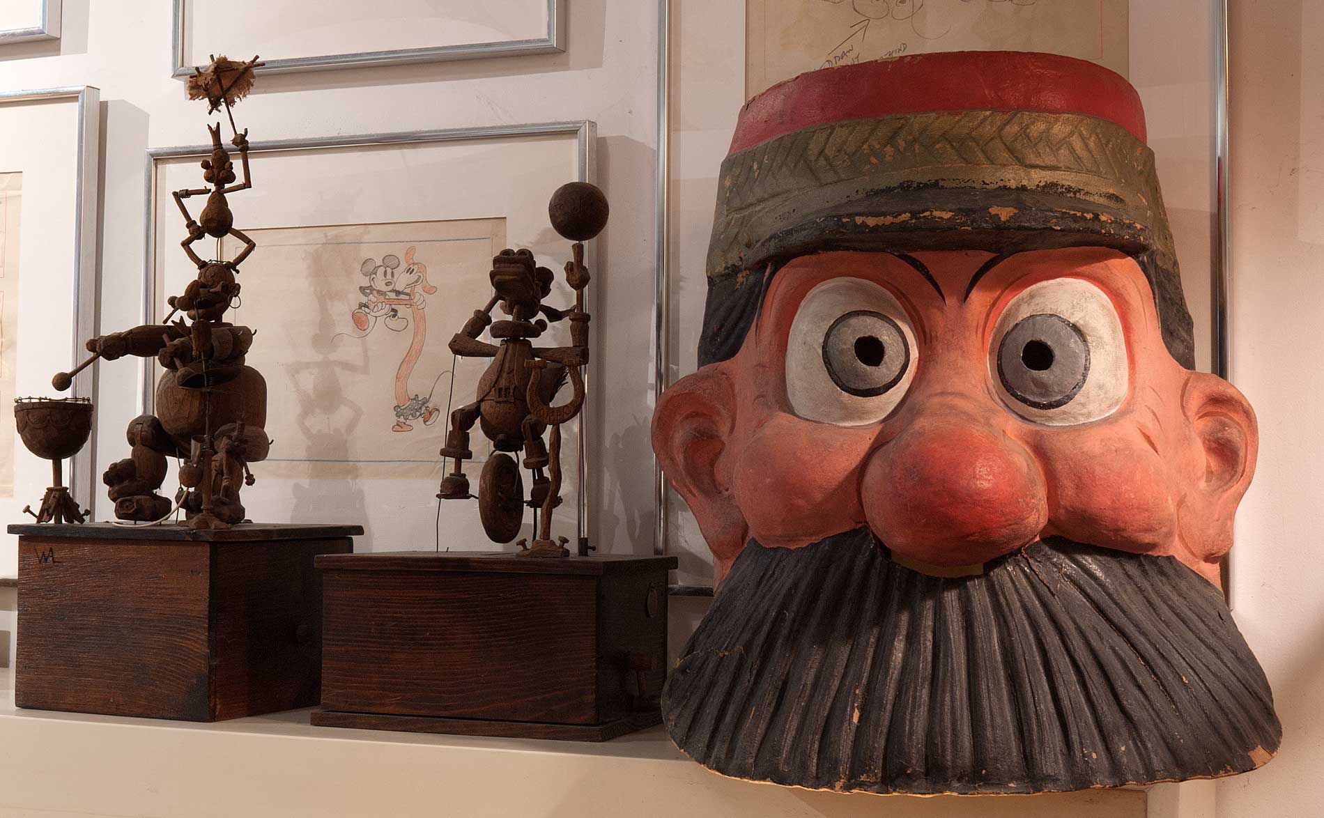 In the upper corner of the large showcase, in the Tall Tower, there is a papier mache Mickey Mouse mask, made in France. It is one of a series that attempts to render the flat paper masks by Einsen Freeman in full dimensional 3-D. Note that even the colorful shading is airbrushed in.