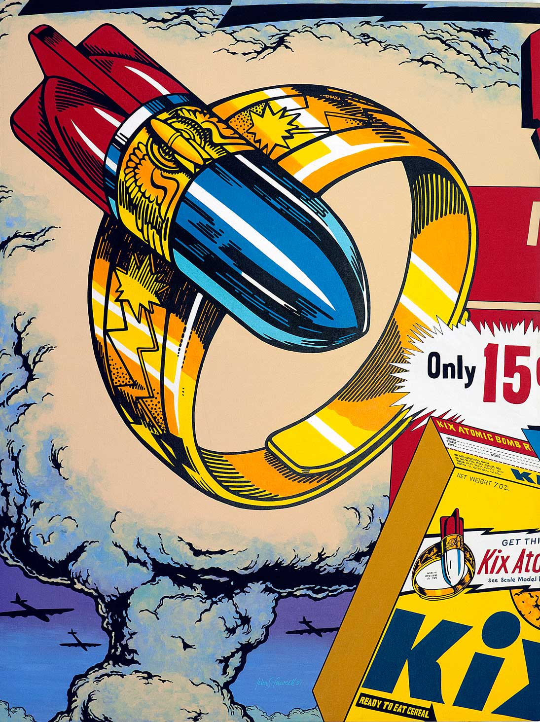Below, is an odd painting that appealed to me. This is John in his more traditional mode, a painting he did between shows. It pays homage to the "KIX Atomic Bomb Ring," the Ultimate Radio Premium! I sat in the hall closet, for hours, in vain, many many years ago. My Atomic Bomb Ring, simply didn’t glow! I guess I got this painting, as a kind of belated compensation.