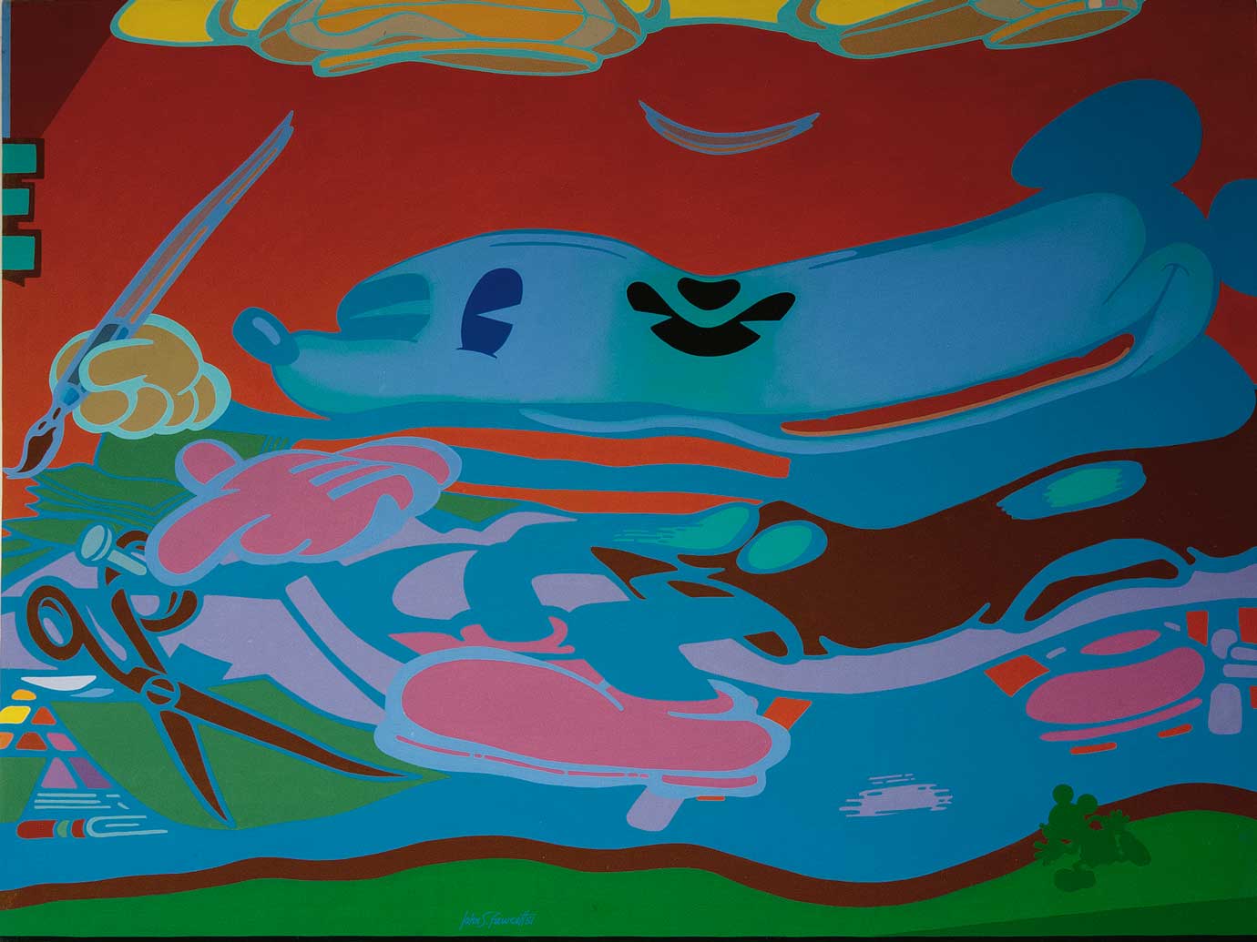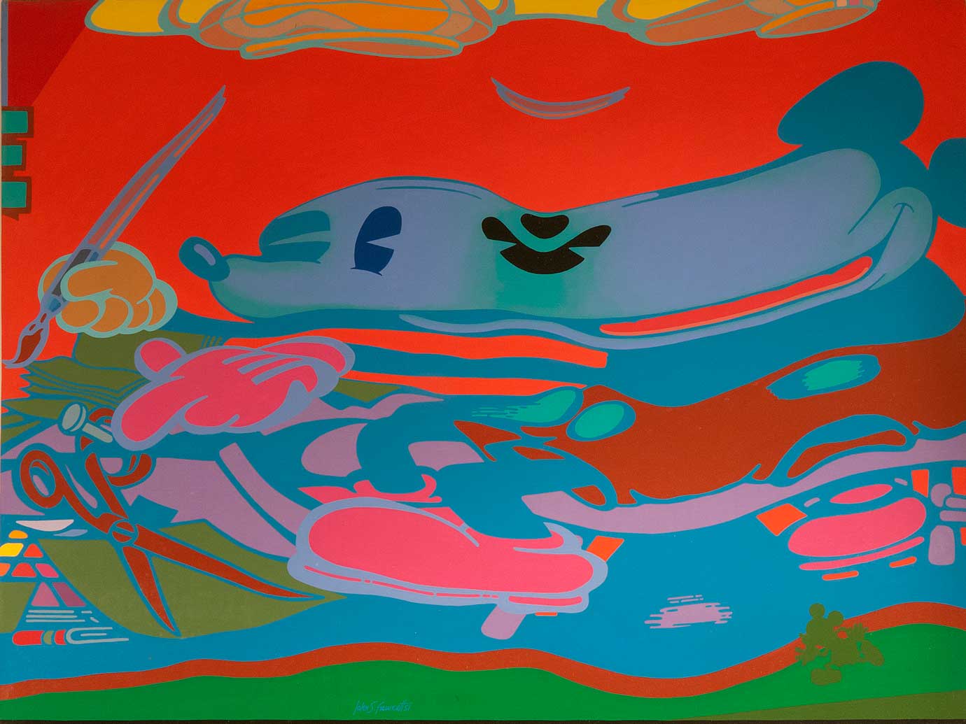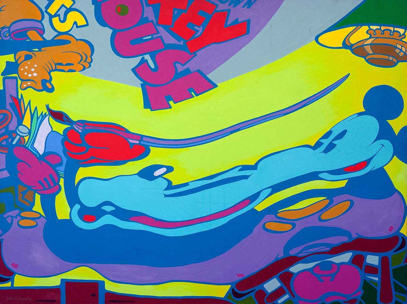 Now for the Transformation! Looking at John’s drawings, one could believe that he might be equally adept at teaching literature. They are so full of literary content, there is nearly as much to read, as there is to see. And, yet, this man taught art! He taught about form, and color, and all the stuff that belongs in art’s domain. And, suddenly, John began to do paintings that were only about the visual, paintings that displayed his ability as a master of playing color games! All quips and quotes and verbal jokes were set aside, and John’s humor and wit were transformed to visual jibes, playing with shapes, and distortion, and chromatic colors that made the eye go crazy with delight!