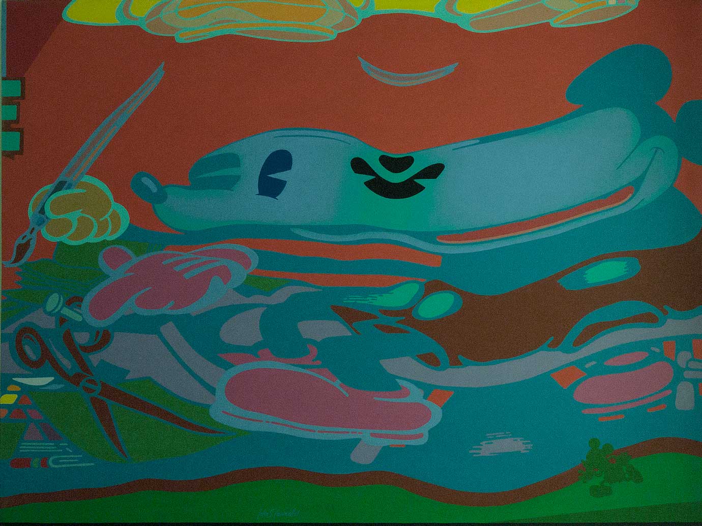 For his next act, John made a breakthrough, one that I thought was brilliant, and accounts for the fact that I now have a house full of these paintings. John discovered that a modern laser copying machine will create amazing, but natural, distortions if the original material is moved, while the copying is taking place. And if the subject matter is moved fast, the image will flip back upon itself. He would, then, study the distorted print, and extract from it an interesting area. And, this he rendered in acrylics, in wild and crazy chromatic colors, on canvases that again measured 3’ by 4’. And so it was, these paintings became exercises in pure form and color, and John drew upon his knowledge, as a teacher of both design and color, to create paintings that were only about visual things, which in my opinion was, always, what painting ought to be. And the wilder the distortions, and more surprising the colors, the more exciting the work was to me.