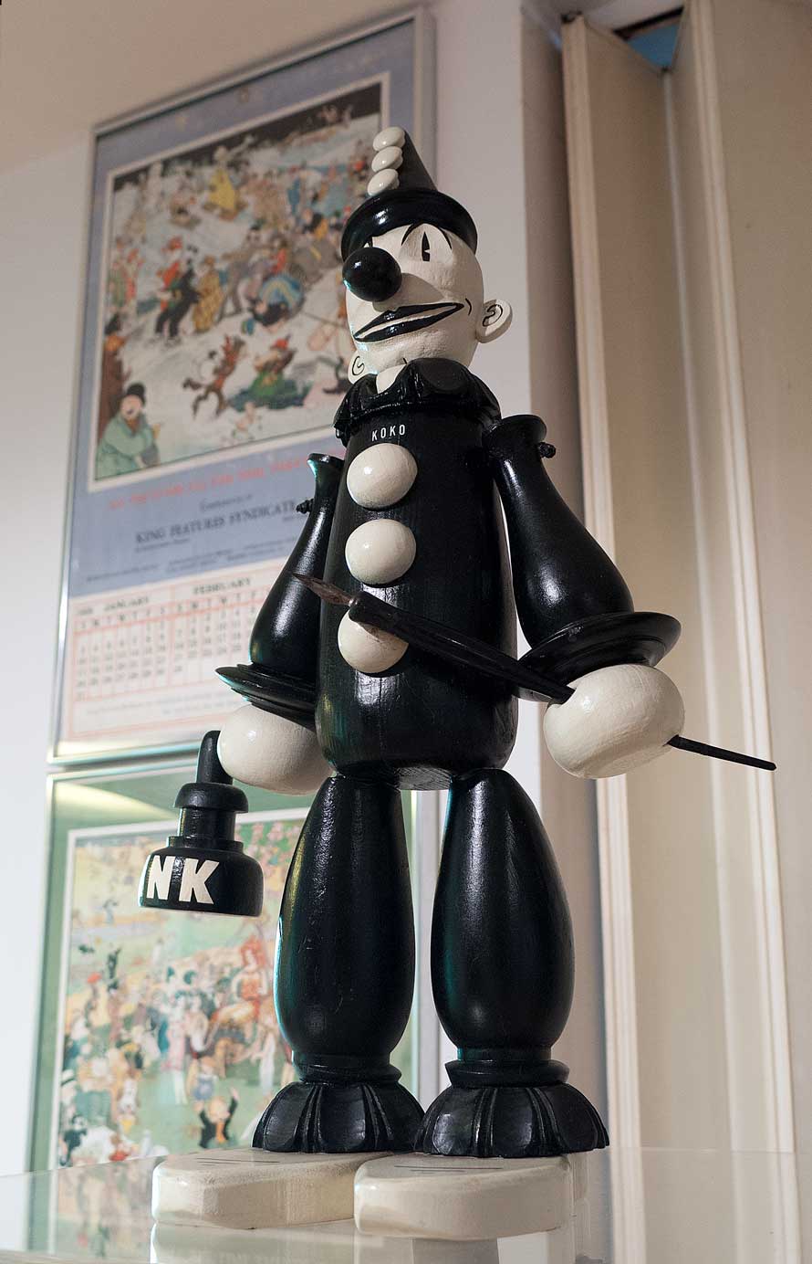 There is another aspect to John’s art that you have to visit his house/museum to see. He makes extremely clever sculptures out of found objects, usually wood turnings, and turns them into comic characters. I managed to pry one of these away from him, this stunning selection of lumber yard remnants, magically transformed into an awesome incarnation of KoKo the Clown. Only KoKo’s face was actually carved by John. The rest is made of wood findings, pieces that he found, and brilliantly recycled.
