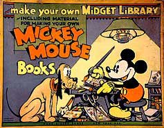 So, here they are, in no particular order, some of the many paintings that hang around the house. They are all form a series of an intended fifty canvasses. I don’t know how many John, eventually, completed, but, there were many more than those I own. All of them are based on a single piece of art that, ironically, belongs to me. It is this box cover from the rare, and only known example of the Blue Ribbon “Mickey Mouse Midget Library”. John is fascinated by images of Comic Characters making art. And thus, every painting in the series of fifty is a variation on this single image.