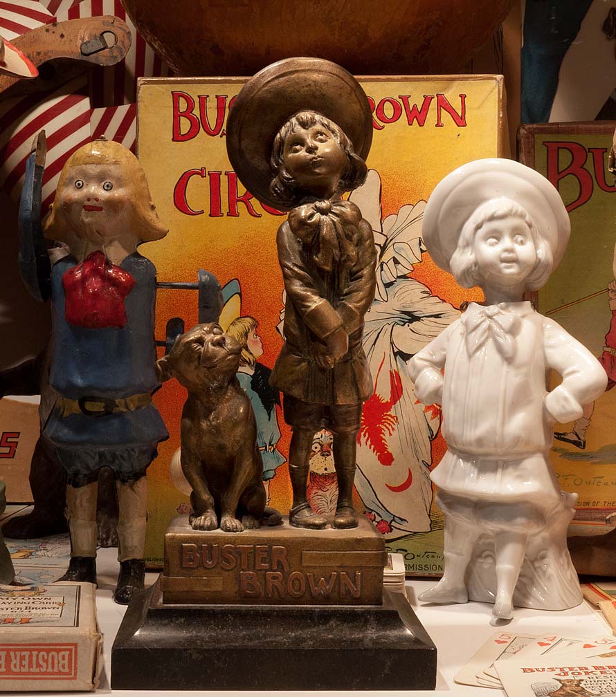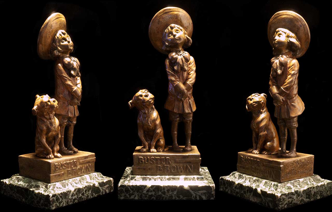 Below, is a painted tin Buster on the left, and a white glazed porcelain Buster with a counter weighted nodding head, on the right, made by Schafer Vater. In the middle, is what might be the most exquisite Buster Brown item of them all. This bronze sculpture, on a marble base, was created by the renowned Austrian sculptor, Carl Kauba. Kauba was born in Vienna in 1865. His intricate bronzes were imported to to the United States between 1848 and 1912. He visited America, around 1886, inspired by the culture of the American West, and traveled to the Western states, where he made sketches and models of native Americans and Cowboys. Nonetheless, all his bronzes were made and cast in Austria.
