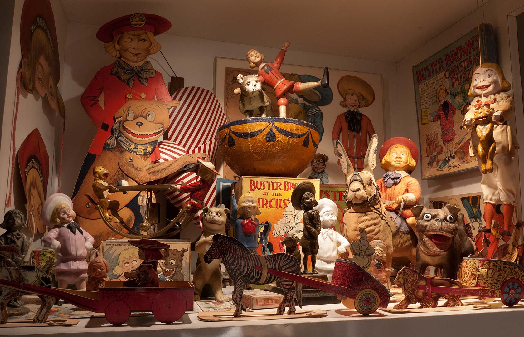 Below, is the Buster Brown showcase. All my Buster stuff is, basically, in one place. I'll attempt to point out some of the items. Starting on the left, there are two Buster masks. The one on the top is high gloss, embossed and made in Germany. It advertises Buster Brown bread. The one below it, sells shoes. Next to these, is an amazing wind operated Animated Display. The Windmill that animates it is made of red and white striped celluloid. This is Green energy, circa 1910. On the back wall, is the Buster Paper doll. And on the side wall, is the Buster Brown Christmas puzzle box. Below that, is another variety of paper doll. And hanging from the top, is Buster, holding Tige. This early composition novelty is suspended on a spring. When it is bounced around, Buster lifts Tige up and down. This photo is also the only one that shows a bisque of Billy Bear. Can you find him? I’ll describe the other things, when we get there.