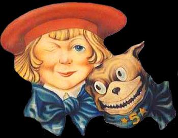 Buster Brown's name and face survived for over a hundred years, by hiding in ten million pairs of shoes! His familiar slogan, preceded by a bark or two, "That's my dog Tige, he lives in a shoe! I'm Buster Brown, look for me in there, too!" echoed in my ears, throughout my childhood years. In all those shoes, for all those years, his familiar face remained, essentially unchanged. The visage is that of a handsome lad with a look that seems angelic. But a mischievous wink reveals his true nature, that of a prankster, and all round trouble maker. Beside him, is his familiar, a pit bull terrier, "Tige", with a grin that is both diabolical and friendly. That’s about it, what Buster Brown is all about, summed up in a single picture