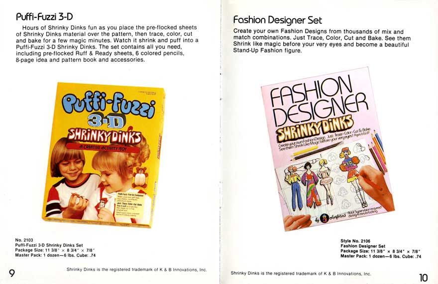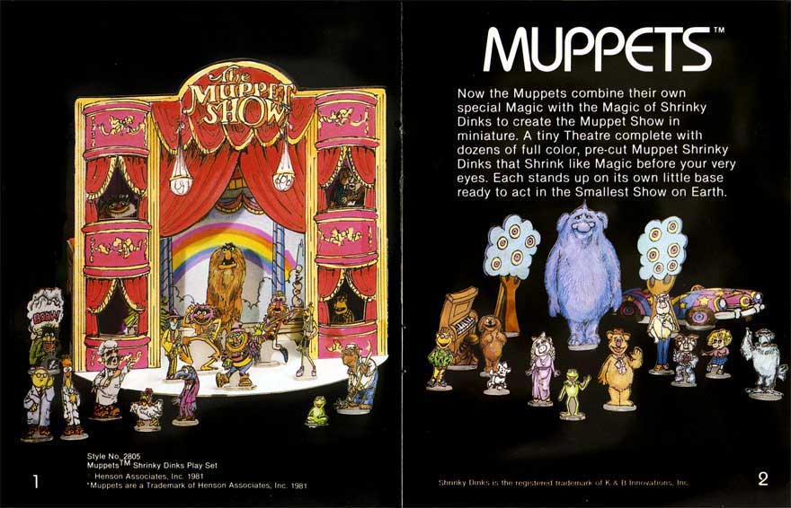 Shrinky Dinks already had a line of products when Colorforms adopted them. This small catalogue shows mainly those pre-existing items. The packaging was pretty awful. Now Andy set about updating and redesigning the line. The only new item, “The Muppet Show”, complete with a tiny theatre, was mine. This was the first of many Shrinky Dinks products I would eventually design.gn