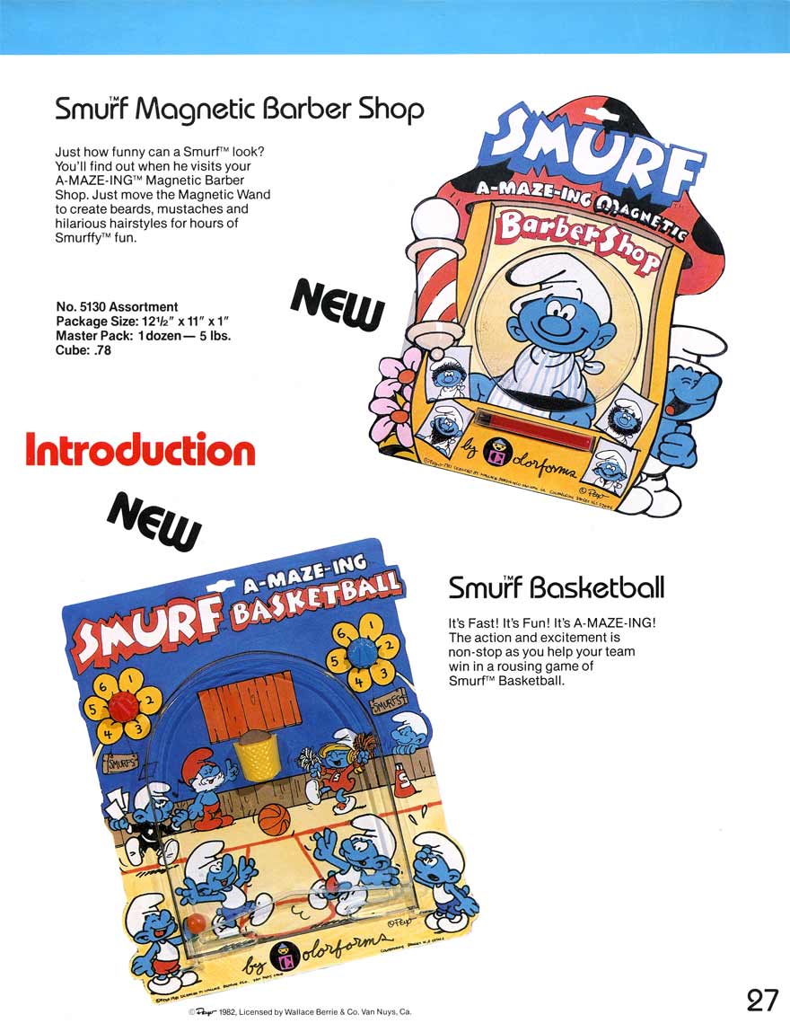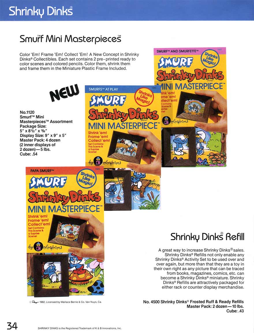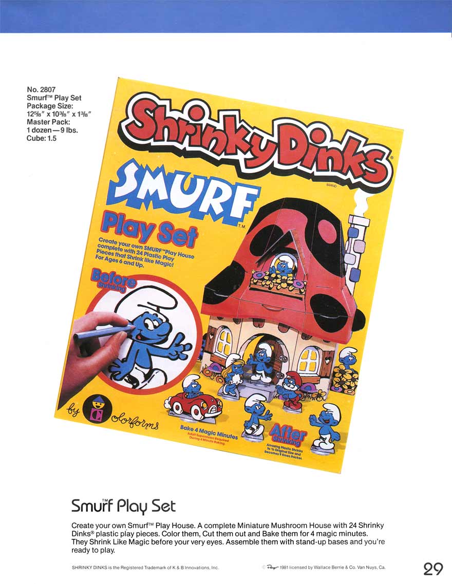 The major Shrinky Dinks introduction for 1983 was the “SMURF” Play Set. It featured a tricky piece of paper construction that formed a “Miniature Mushroom House” concocted by yours truly, and an army of little blue Smurfs, and one Smurfette, designed, colored, cut, and baked by Mike. The original handmade prototype has miraculously survived.