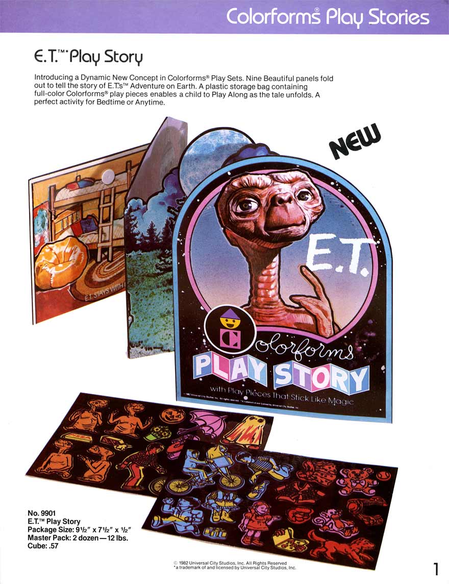 The timeline of this website is, admittedly, confusing. It is organized by the items that appeared in the catalogue for any given year. But, as the catalogues came out each year at Toy Fair, which was in February, and the photos in them were all shot in December of the year before, the events involving the creation of the items occurred in the year before as well. Not that any of this matters, 30 years later. Anyway, the big event for Colorforms in 1982-1983 was the coming of E.T.