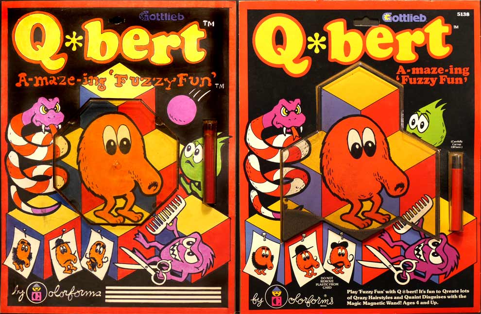 “Q-bert” A-Maze-ing “Fuzzy Fun” is an interesting example of how harmoniously Mike and I worked together. We were a perfect team. My comp is on the left. Mikes finished art is on the right. I had to use an existing blister for the prototype. A custom-made blister was created for the finished product.