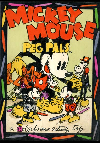 Here is the original Waddle Book alongside my intentionally derivative sketch for the Mickey Mouse Peg Pals box. If you “mouse over” it you’ll see Mike’s original art. The mouse portion of which was then “dropped into” the original bright colored photo, not the dull print used here, only for position. Mike handled the entire process, type, mechanicals, everything, based only on the material you see here. He was a treasure. Working with him was a pleasure. Colorforms had struck GOLD!