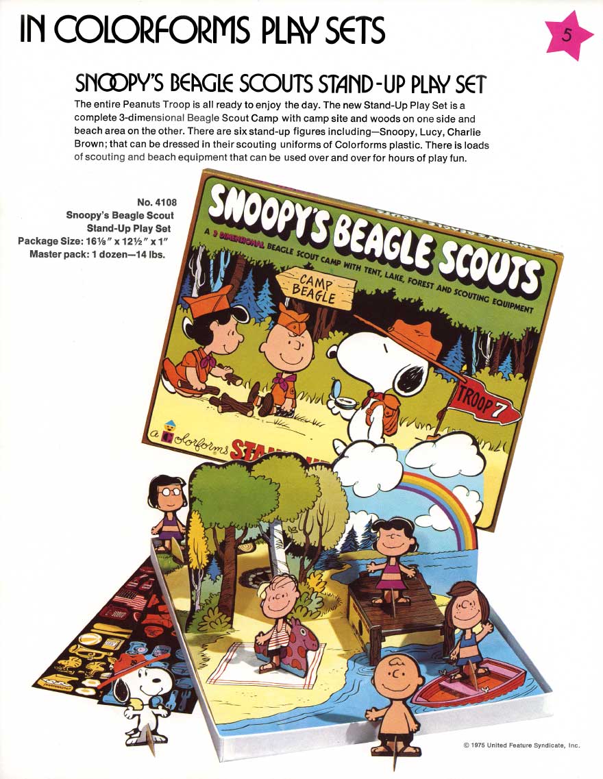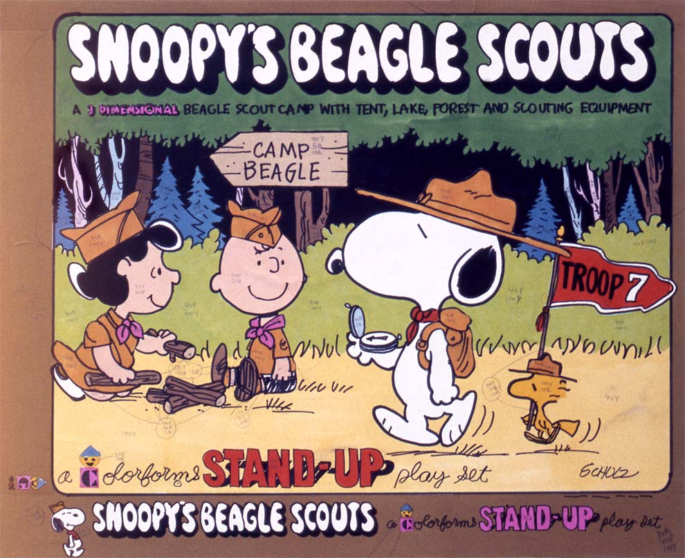 My sleeve was not yet empty, in the year leading up to Toy Fair 1975. There were still a few tricks up there to expand the Colorforms line. This year's big addition was the “Stand-Up Play Set”. “Soopy’s Beagle Scouts” was the theme. A two-sided central panel stood up to create two different play environments, one on either side, connected by a door. In this case, the forest and the beach. The sides of the dock folded down to hold the divider upright and lock it in place. Six Stand-up figures of the Peanuts gang could be dressed up in Colorforms vinyl pieces and moved around the board. There was lots of stick-on camping equipment too. Here is the comp, just off the drawing board, and photographed on my front porch.
