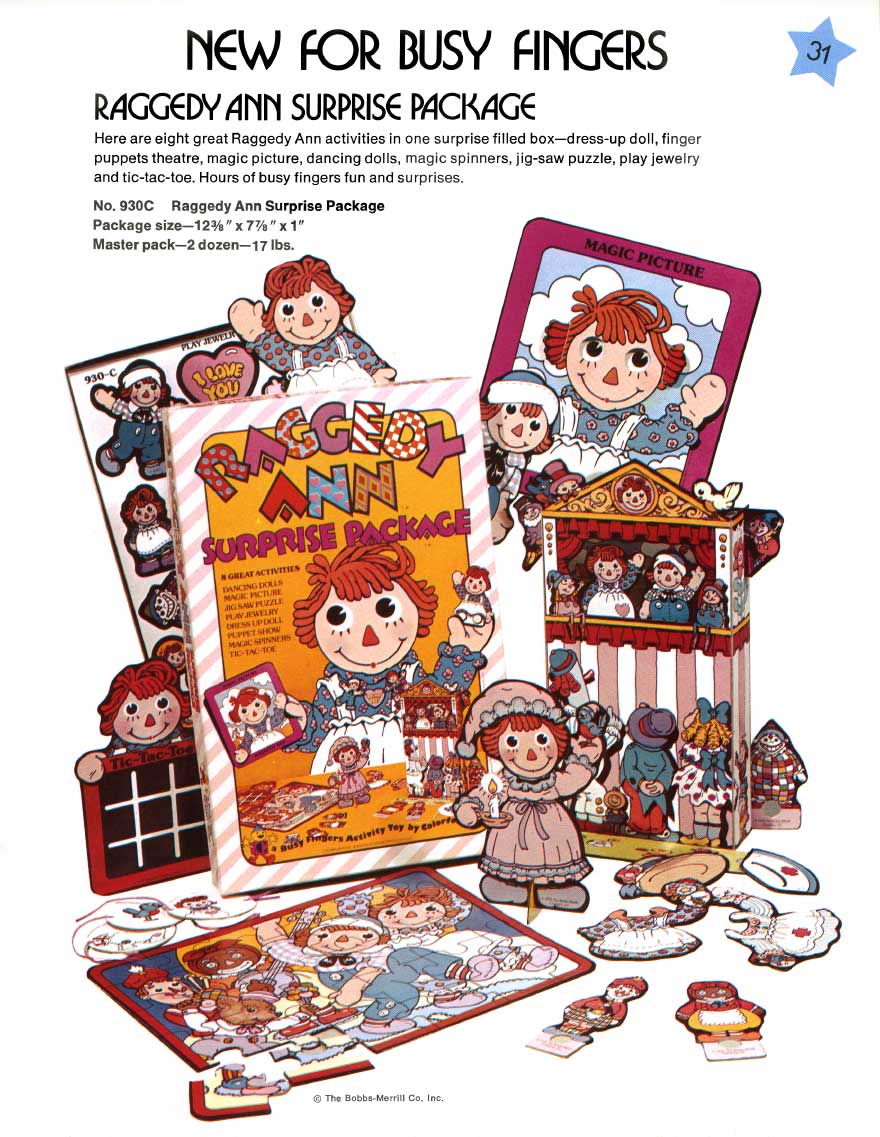 Of all the activities, the Raggedy Ann Surprise Package was my favorite. I included all my best tricks and favorite characters. Dancing Dolls, a Magic Picture, whose eyes followed you around the room, a Jig Saw Puzzle, based on a1930’ original, Play Jewelry, a Finger Puppet Show, Magic Spinners, which were an early optical toy, a Dress-up Doll, and Tic-Tac-Toe; 8 Great Activities, in all.