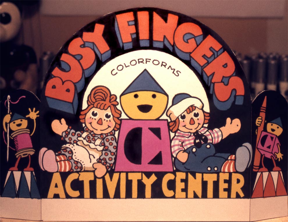 Meanwhile, The Busy Fingers Activity line continued. It was a Raggedy Ann Year. This comp for a display header set the tone. Sewing had been added to the agenda. I was also doing all I could to turn the Colorform’s logo into a sort of Comic Character, an advertising icon along the lines of Mr. Peanut.