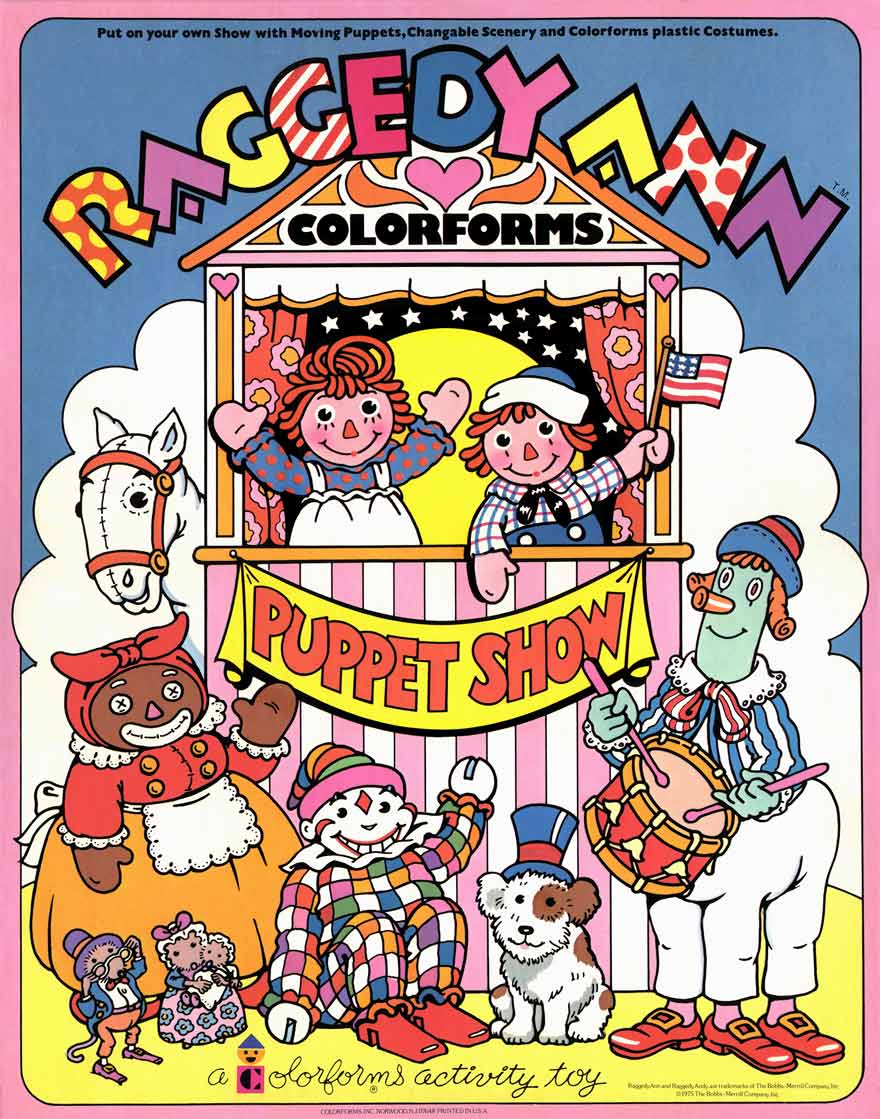 My fascination with Raggedy Ann continued. This heavily patched little ink drawing led to “The Raggedy Ann Colorforms Puppet Show”. Harry agreed to do it, even though, Puppetforms sales were slowing down., I again seized the opportunity to inject some of Johnny Gruelle’s early characters that few people know about today. I, more or less, got carried away.