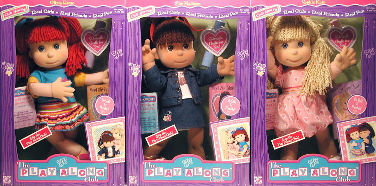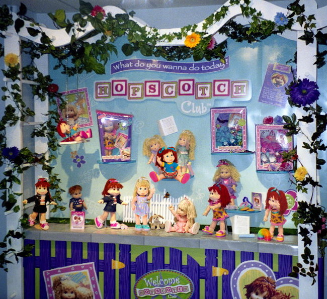 b Meanwhile, Play Along didnt like the name "Acorn Family" or the Family Tree idea. Maybe it was just too big a concept, Ha! They came up with another, "The Hopscotch Club", and planned to introduce three dolls, instead of 35. The package cleverly resembled a club house, with a piece of chalk included for playing hopscotch. The acorn in one ear became a butterfly. I liked it. And that is how they showed it, in a private office at Toy Fair. They hadnt had the time to make a grand presentation, so rather than not showing it at all, they invited just their major buyers in to test their reaction.