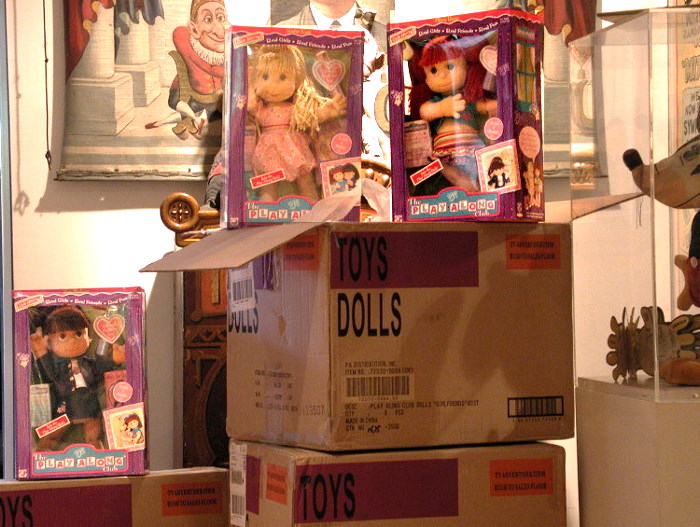 The Obb and I were invited to see it too. We loved what they had done! And so too did their major buyers. Well, that is to say, they liked it well enough to say theyd try it, which was all that Play Along had hoped to hear. And thus, the President of the company announced, while we were there, that he was definitely "doing it for the coming year!" The Play Along Club Between then and now, it was discovered that the Hopscotch name was taken, so the "Hopscotch Club" became the "Play along Club". I like that better! The piece of chalk remained. In the days that followed, Play Along fleshed out the project. Fashions and accessories were created and charming stories written. I had given the dolls common names that were essentially generic. But Play Along took the opposite approach and gave each doll a name that is unique. Jessica Jones became Olivia Reese, Samantha Smith is Sophie Kate, and Betty Brown is now called Zoe Madison. Each is a distinct individual. I like that better too. May they have many wonderful adventures together and live happily . ever after. A few days ago several big boxes arrived at the front door. I carried them up into the hall.