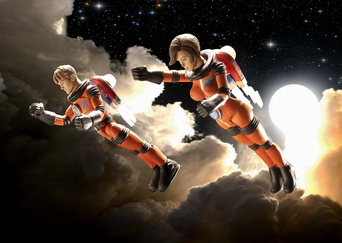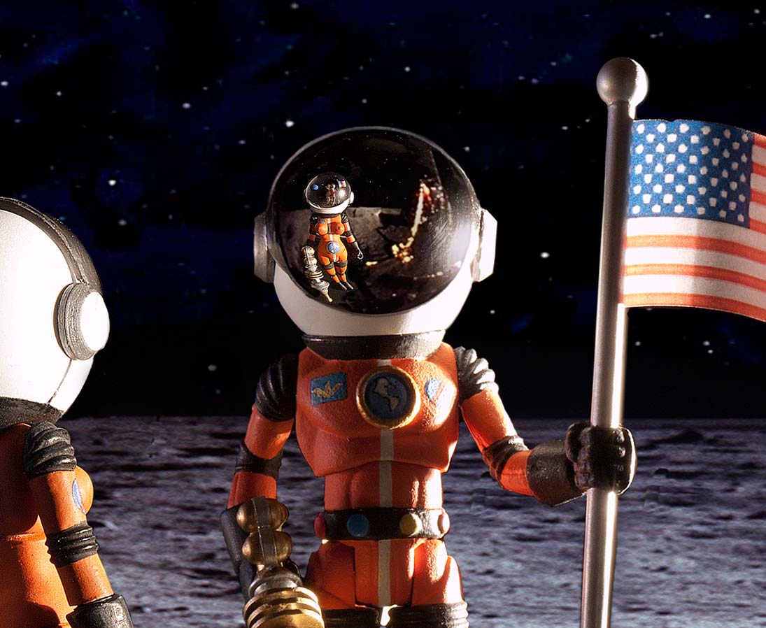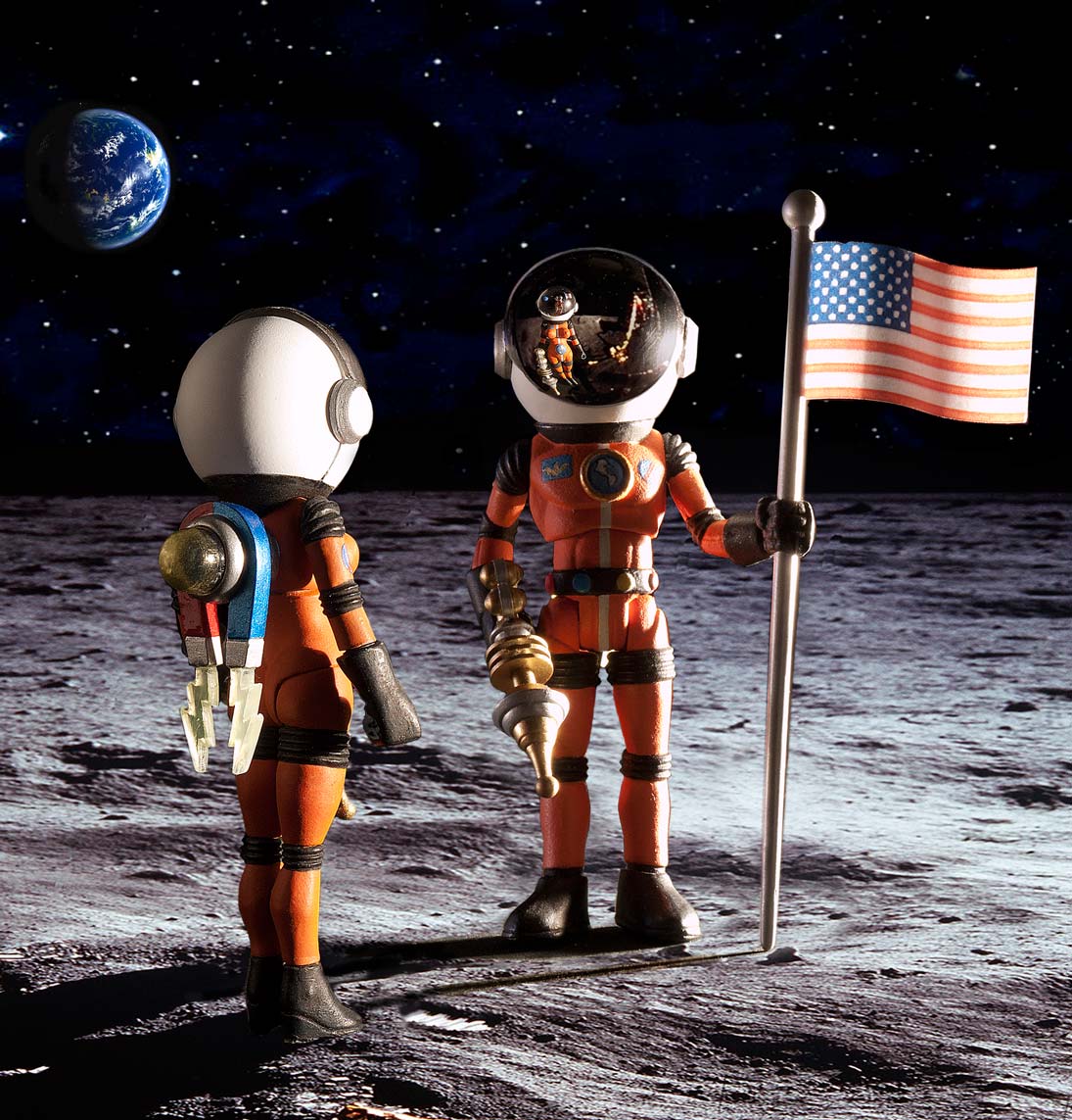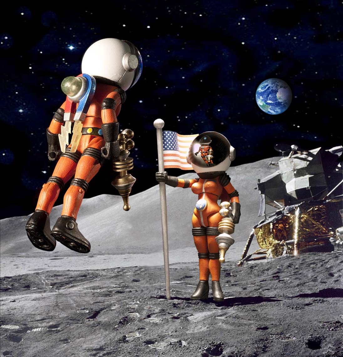 But the rest are of both Jack and Terra together. I made one each with Jack and Terra as the central figure on the moon with flag. With the reflection of the other in their helmet. Of course, the second figure is where the magic comes in, It shows the Anti-gravity device, too good to waste hidden behind, and also, in one case, demonstrates how it operates. Last is simply a flight of fancy. By this time I was getting carried away.